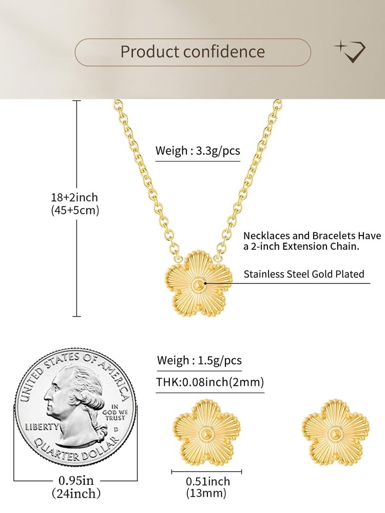 Four Leaf Clover Necklace and Stud Earrings Set for Women Lucky Flower 14K Gold Plated Jewelry Product Details Color: Metal-14K Gold Plated Brand: Qinpan MPN: DZTZ1012 UPC: 784853514272 EAN: 0784853514272 Product Dimensions ‏ : ‎ 18 x 0.52 x 0.1 inches; 0.23 ounces Item model number ‏ : ‎ DZTZ1012 Department ‏ : ‎ womens Date First Available ‏ : ‎ June 7, 2024 Manufacturer ‏ : ‎ QINPAN Brand, Seller, or Collection Name: Qinpan Material: Yellow Gold Gem Type: No Gemstone Setting: Bezel Setting Item Length: 18 inches Chain: Link Chain Clasp: Spring Ring Clasp Number of stones: 3 Stone Weight: 4.00 cttw Model number: DZTZ1012 Metal: 14K Gold Plated Metal stamp: 14K Gold Plated Metal Weight: 6 g Minimum clarity: SI1-SI2 Stone shape: Flower Cut: Very Good Stone Creation Method: Synthetic Stone Treatment Method: Clarity Enhanced