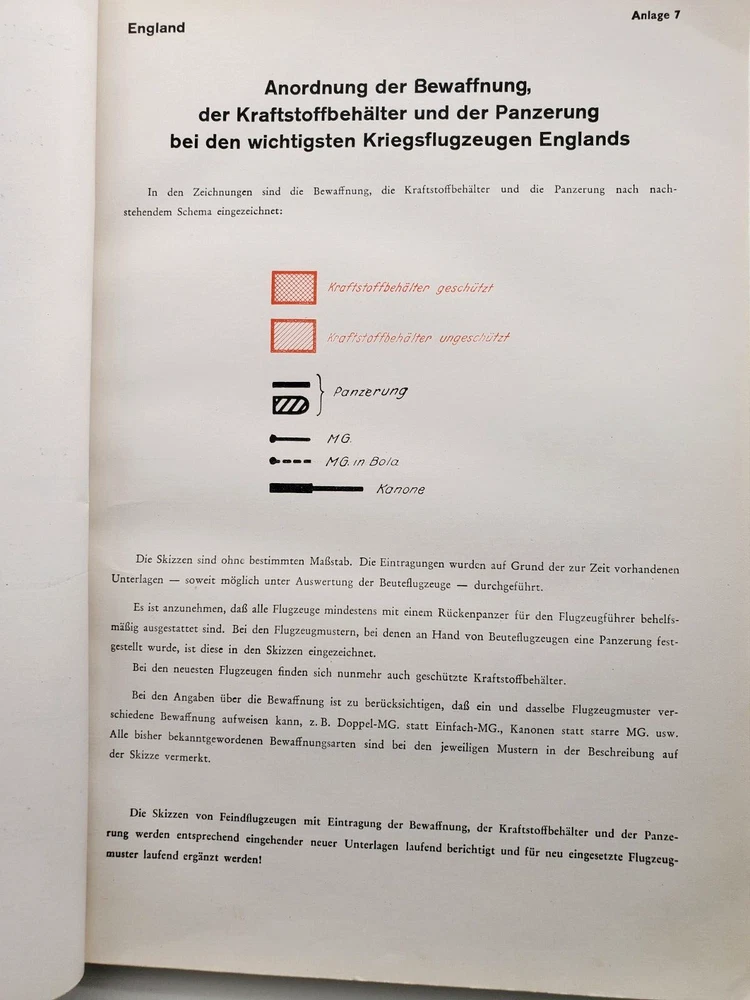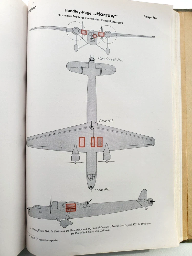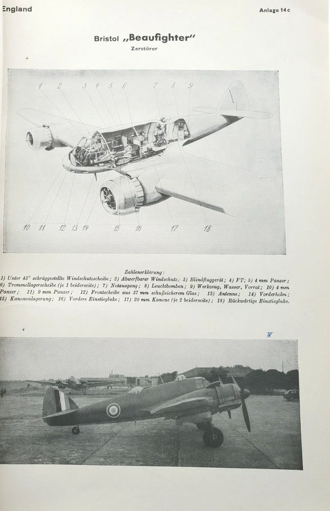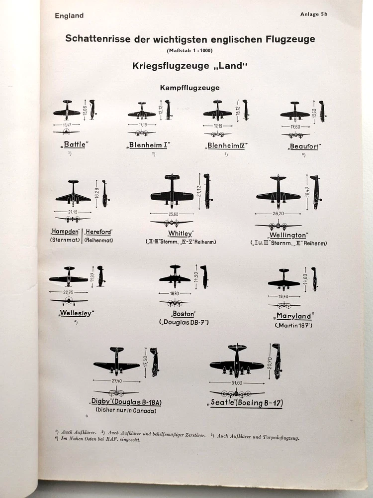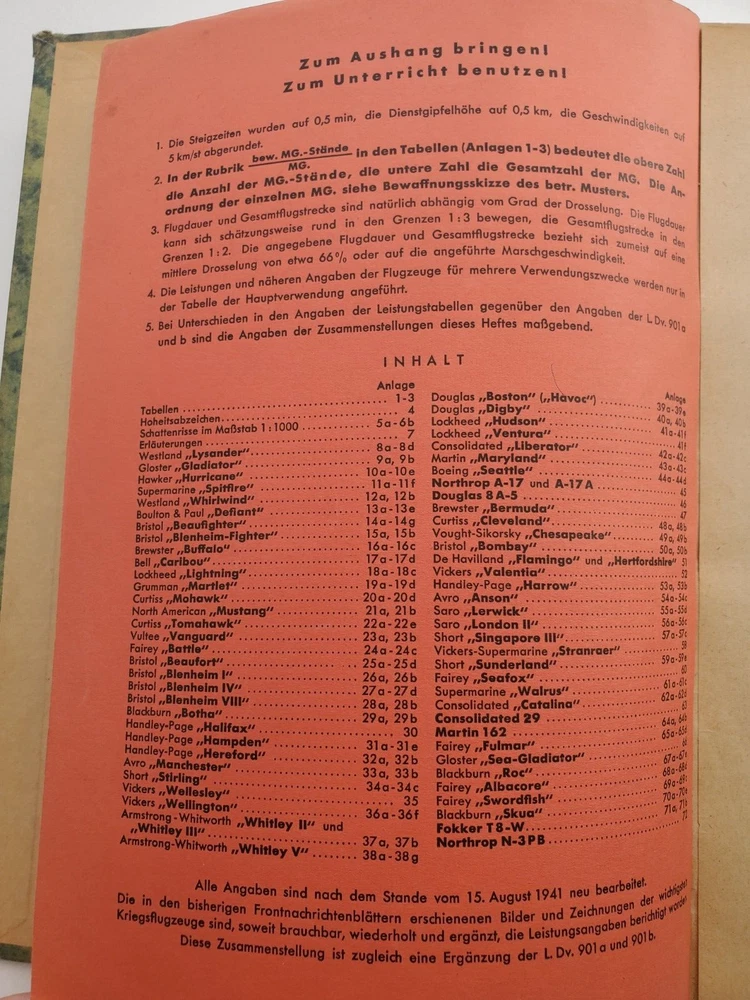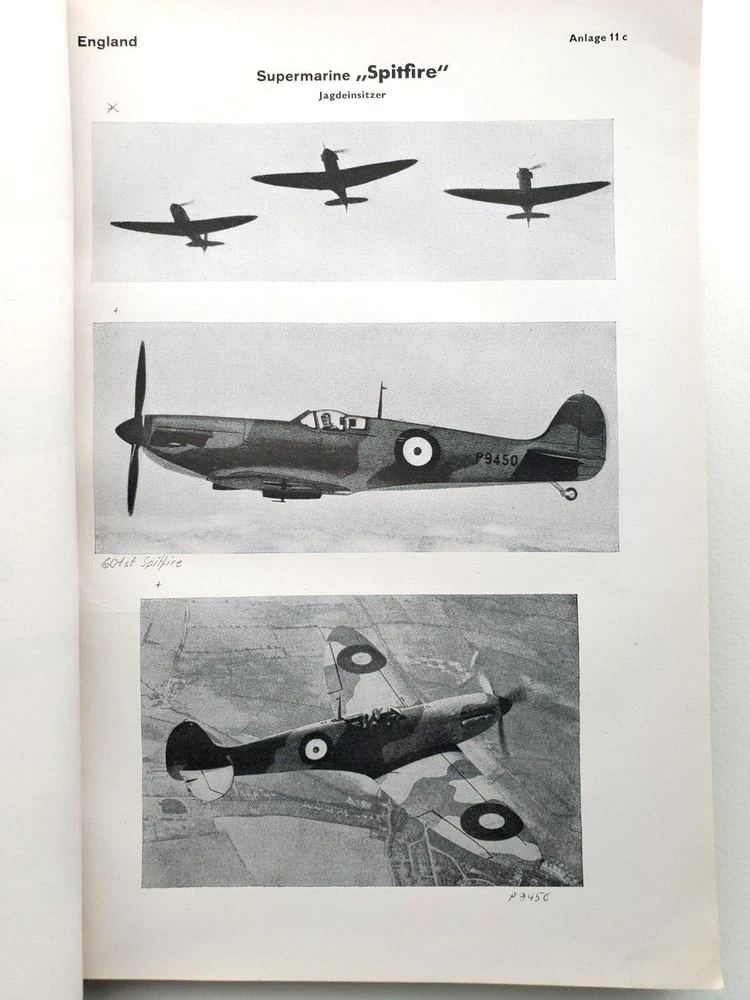 "SPECIAL EDITION - BRITISH WARPLANES WITH USA DELIVERIES" A Luftwaffe field guide for facilitating the identification of allied aircraft in 1941. This is a very unique piece of WW II aviation history. It is a German Recognition Manual for many of the aircraft flown in the British Royal Air Force early in the war - the guide was apparently printed in 1941.The book has a short introduction on aircraft identification, a pull out chart with specs on numerous aircraft and then photos and illustrations of around 60 different RAF planes, including some rather rare types. In the case of some aircraft, there are also schematic drawings that show the position of fuel tanks and armament, providing the pilot important information to aid in shooting down one of these enemy craft (I have included examples of some of these). The original guide has been bound - this the case of this volume, the binding it not in great shape. During the life of this volume, one of its owners decided to write with pen (very small and tidy print) the English name of the aircraft or the squadron it could be found in on certain pages. From the inscription, it appears that the book was passed on as a birthday gift from on aviation enthusiast to the next. There were apparently two books (both of which I have for sale) that were presented as gifts. In the one inscription (from the volume on Soviet aircraft), the gift giver, Klaus Henke, states the following (in German - translated with Google) “ Take this book as a sign and expression of my deepest connection and sincere friendship. Take care of it as well as I do, because it comes from the estate of one of my uncles, who - like us - was dedicated to aviation and had to lose his life in an insane war for it! With a broken neck and a leg, your friend.” Based on this inscription I am led to believe that his uncle, whose recognition guide this was originally, was in the Luftwaffe and died in the war.