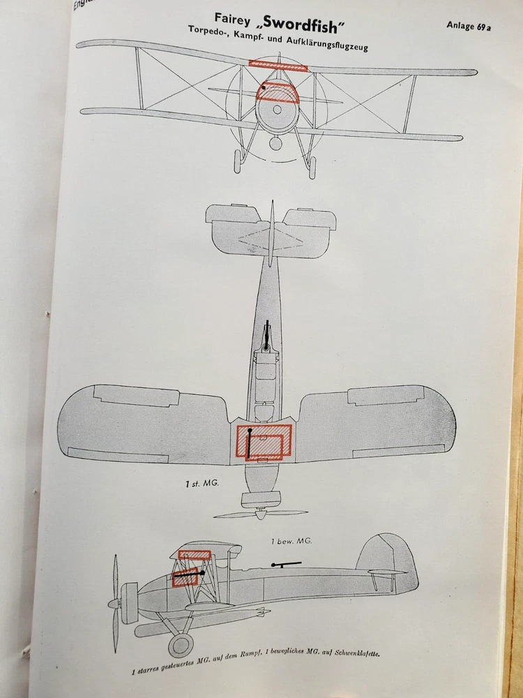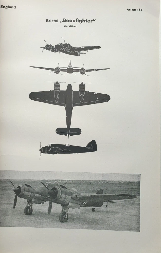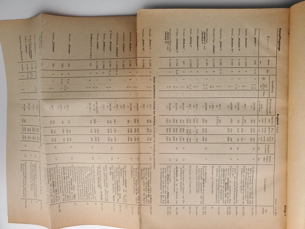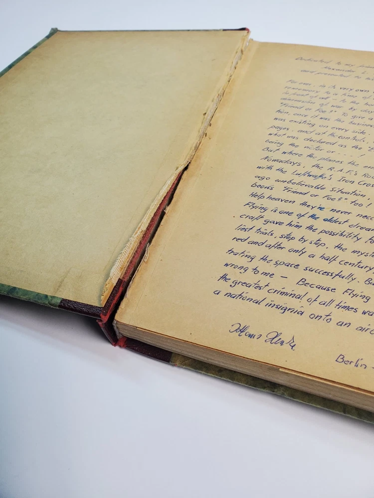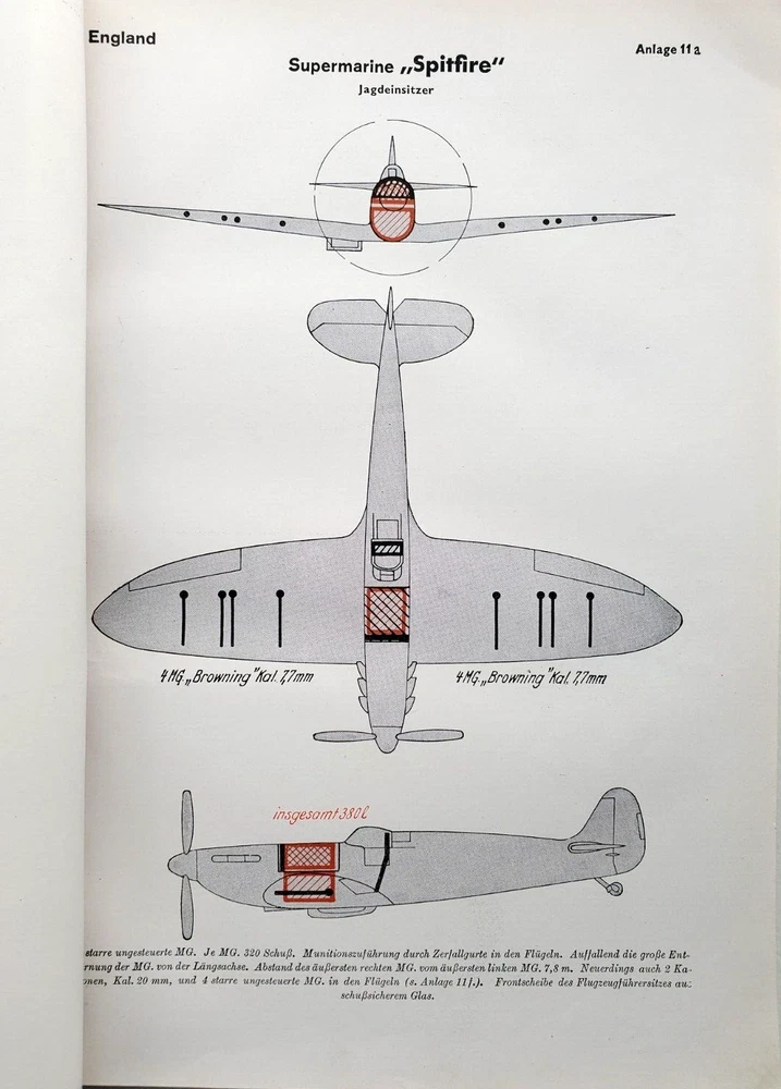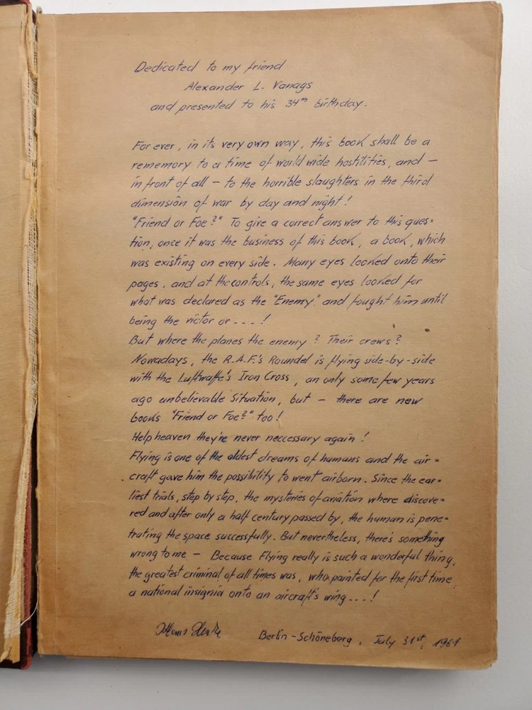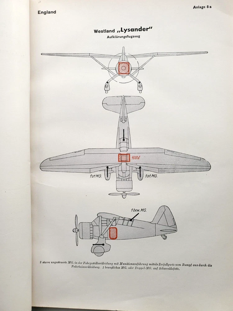 "SPECIAL EDITION - BRITISH WARPLANES WITH USA DELIVERIES" A Luftwaffe field guide for facilitating the identification of allied aircraft in 1941. This is a very unique piece of WW II aviation history. It is a German Recognition Manual for many of the aircraft flown in the British Royal Air Force early in the war - the guide was apparently printed in 1941.The book has a short introduction on aircraft identification, a pull out chart with specs on numerous aircraft and then photos and illustrations of around 60 different RAF planes, including some rather rare types. In the case of some aircraft, there are also schematic drawings that show the position of fuel tanks and armament, providing the pilot important information to aid in shooting down one of these enemy craft (I have included examples of some of these). The original guide has been bound - this the case of this volume, the binding it not in great shape. During the life of this volume, one of its owners decided to write with pen (very small and tidy print) the English name of the aircraft or the squadron it could be found in on certain pages. From the inscription, it appears that the book was passed on as a birthday gift from on aviation enthusiast to the next. There were apparently two books (both of which I have for sale) that were presented as gifts. In the one inscription (from the volume on Soviet aircraft), the gift giver, Klaus Henke, states the following (in German - translated with Google) “ Take this book as a sign and expression of my deepest connection and sincere friendship. Take care of it as well as I do, because it comes from the estate of one of my uncles, who - like us - was dedicated to aviation and had to lose his life in an insane war for it! With a broken neck and a leg, your friend.” Based on this inscription I am led to believe that his uncle, whose recognition guide this was originally, was in the Luftwaffe and died in the war.