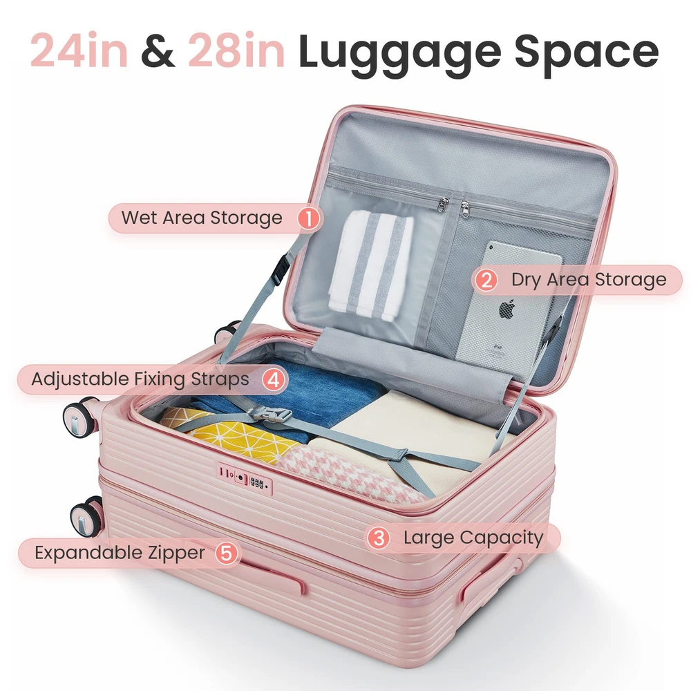 Luggage Sets 3 Piece(20/24/28), Expandable Carry On Luggage with TSA Lock Airline Approved, 100% PC Hard Shell and Lightweight Suitcase with Front Pocket and Spinner Wheels Specifications Place of Origin China Main Color Pink Main Material PC Dangerous Goods #dangerFlag# Dimensions & Weights Assembled Length (in.) Not Applicable Assembled Width (in.) Not Applicable Assembled Height (in.) Not Applicable Weight (lbs) Not Applicable Product Features FRONT LAPTOP COMPARTMENT to safely store and easily access electronics. Separate your electronics from clothing. Suggested laptop size 15.6 inches and under.