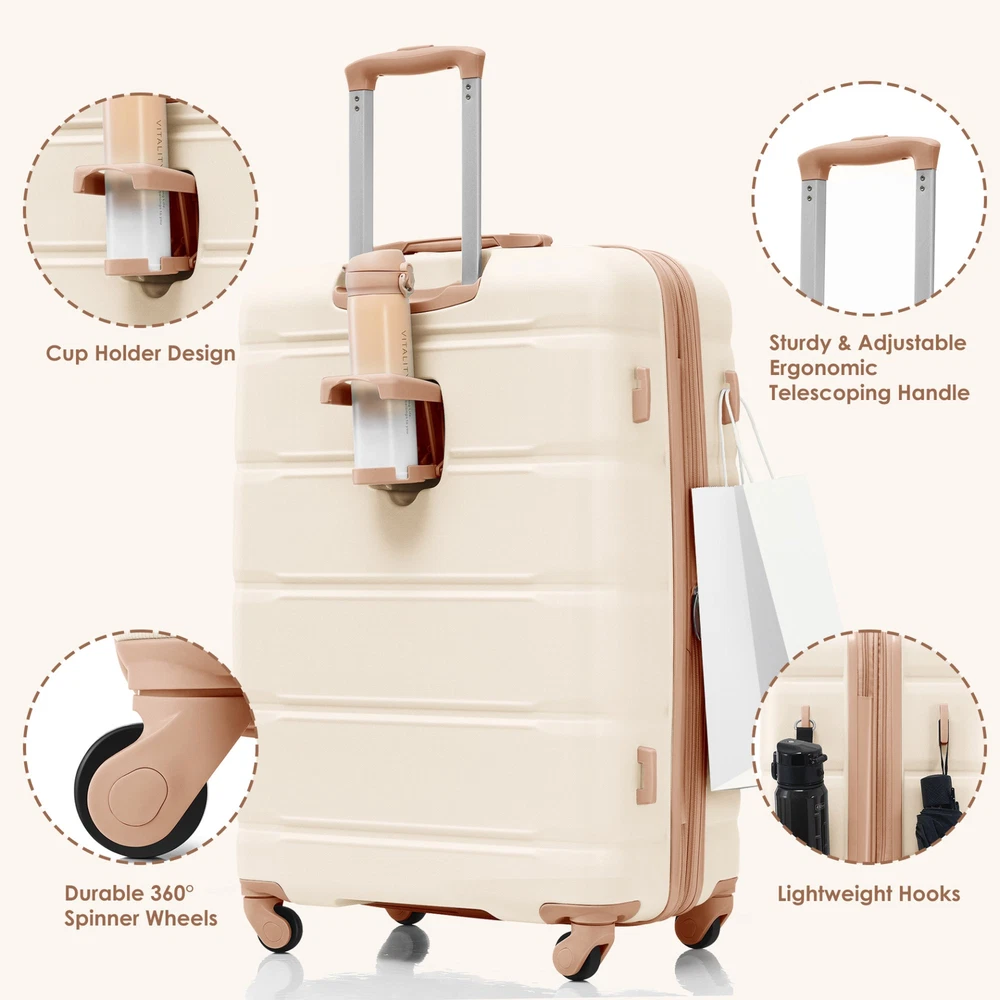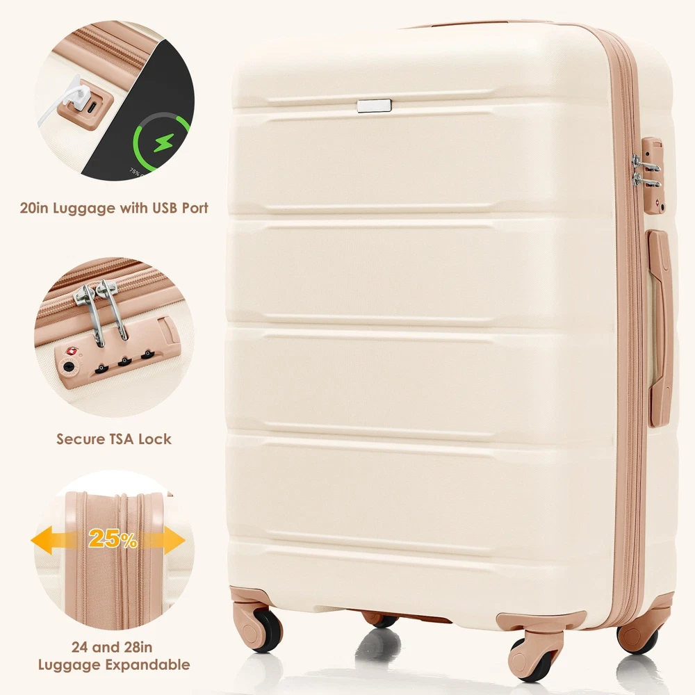 Luggage Sets 4 Piece, 20-inch with USB Port, Expandable ABS Durable Suitcase with Travel Bag, Cup Holder, ABS Hard Shell Luggage with Spinner Wheels, beige and golden Specifications Place of Origin #originPlace# Main Color Beige+Gold Main Material ABS Dangerous Goods #dangerFlag# Dimensions & Weights Assembled Length (in.) 19.20 Assembled Width (in.) 11.60 Assembled Height (in.) 28.40 Weight (lbs) 24.25 Product Features 【High Quality Luggage Sets】Made from extra strong ABS material, which is lightweight and extremely durable. Features textured finish to prevent against scratches,keeping lightweight luggage set beautiful trip after trip.