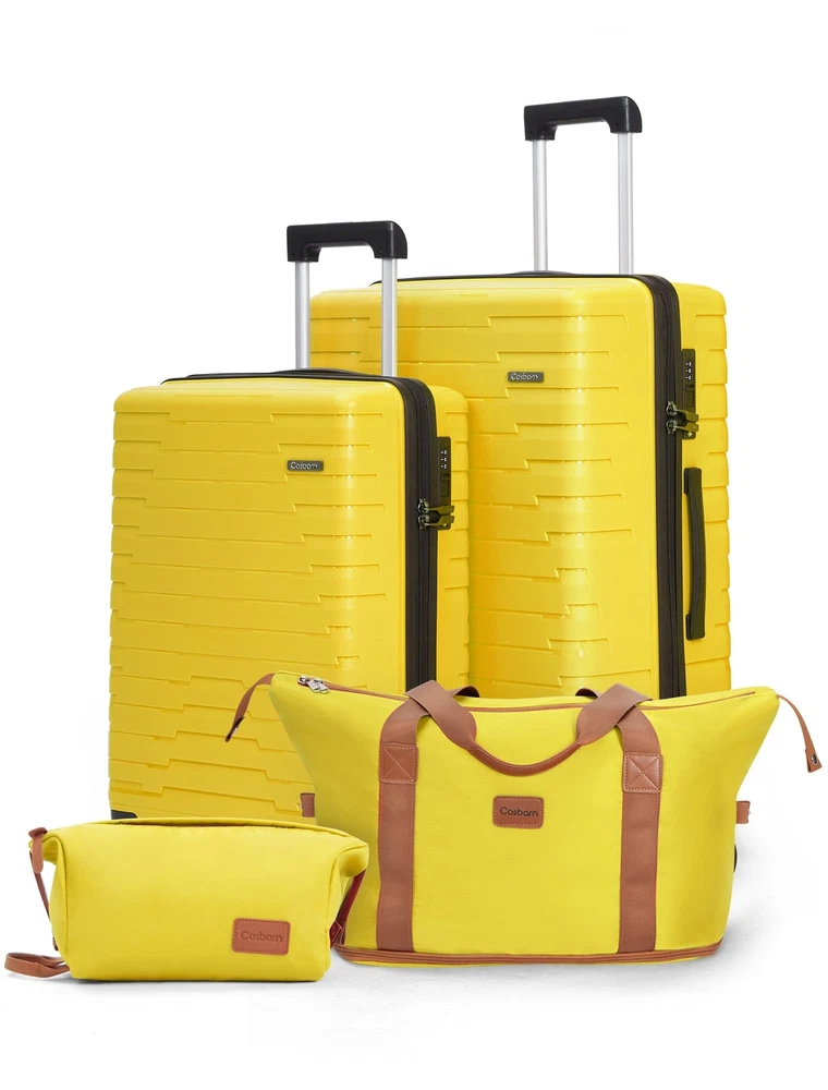 Description Luggage Sets 4 Piece, Suitcases with Wheels, PP Hard Case Luggage with Upgraded Shock-absorbing Spinner Wheel&TSA Lock, Carry On Luggage Set 【4 Piece Luggage Set】Luggage sets include a 24-inch large suitcase, 20-inch carry on luggage, extended duffel bag, and a toiletry bag. The duffel bag features a back sleeve so you can conveniently attach it to the retractable luggage handle. 【High-quality PP Material】PP luggage sets feature high-quality PP material, known for its recyclability and environmental friendliness compared to ABS. The PP luggage boasts superior resistance to extreme temperatures, increased impact resistance, and a reduced risk of cracking, making it a durable and sustainable choice for travelers. 【TSA Lock & YKK Zipper 】luggage sets are equipped with premium features, including a mounted TSA-approved lock for enhanced security and a fully-lined interior divider with organization pockets to keep belongings neat. The reinforced and upgraded YKK zippers effectively prevent splitting, ensuring reliable and secure travel for your valuables. 【Upgraded Shock-absorbing Wheel】 Enjoy silent and smooth mobility with our luggage's 360° double spinner wheels. Equipped with 8 high-quality, shock-absorbing wheels, this design ensures quiet and smooth travel. The double wheel configuration enhances durability and provides superior directional control for effortless maneuverability in any direction. 【Full Aluminum Telescopic Handle】Hard shell suitcases feature an ergonomic 3-stage retractable trolley with TPU handles on the top and sides, making it effective for a variety of occasions