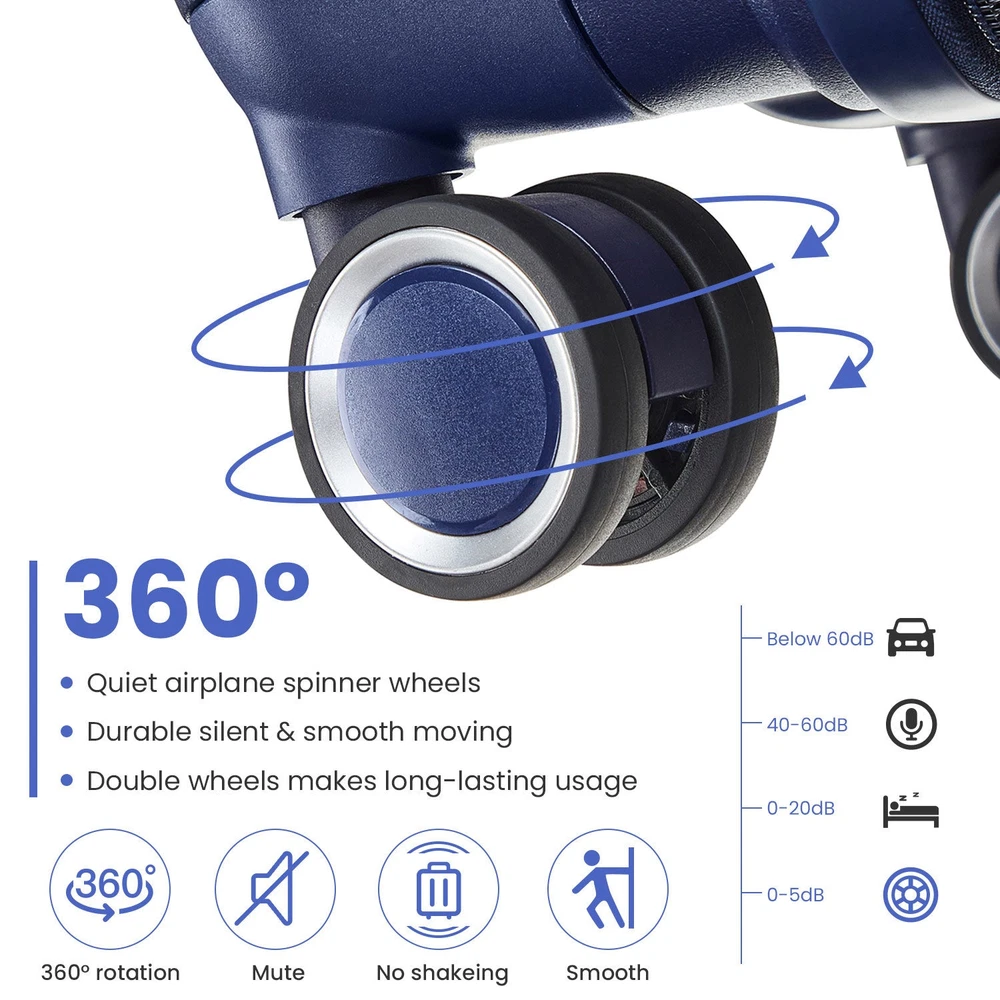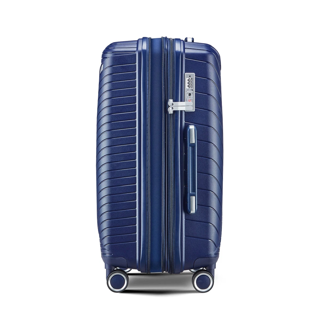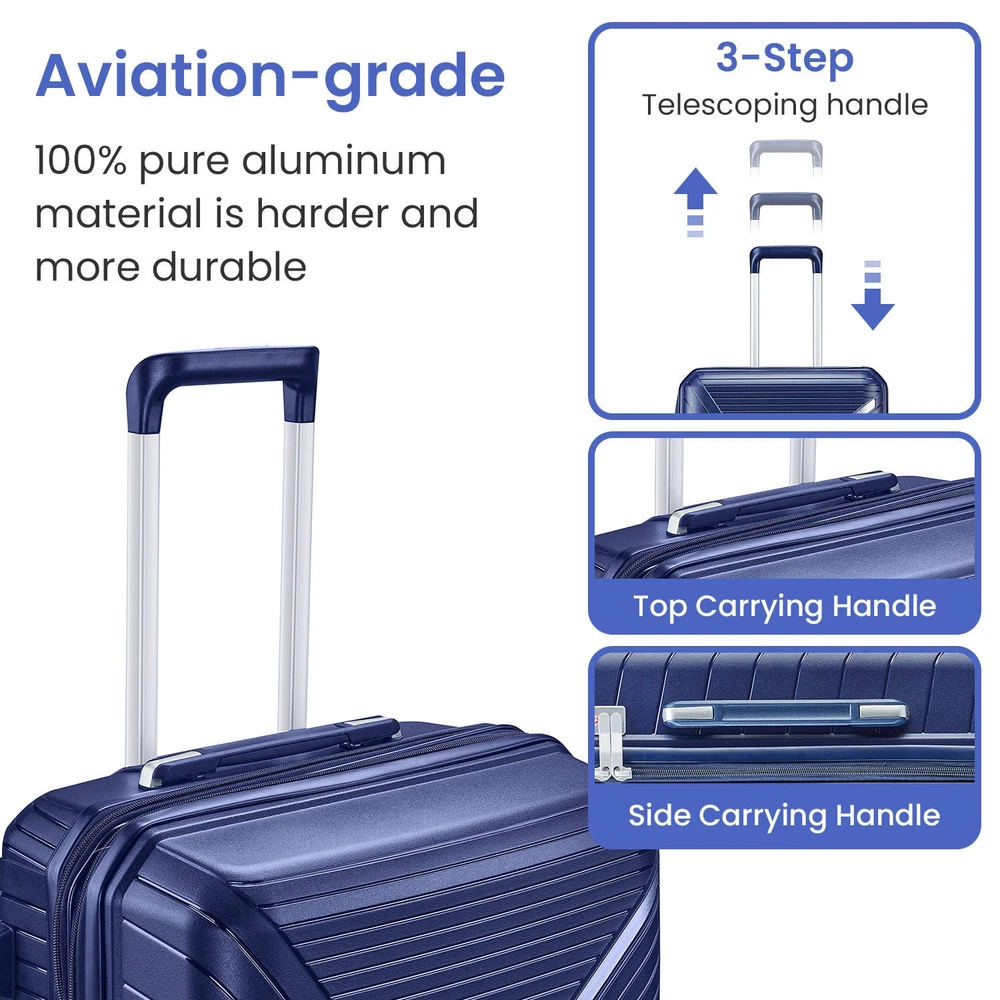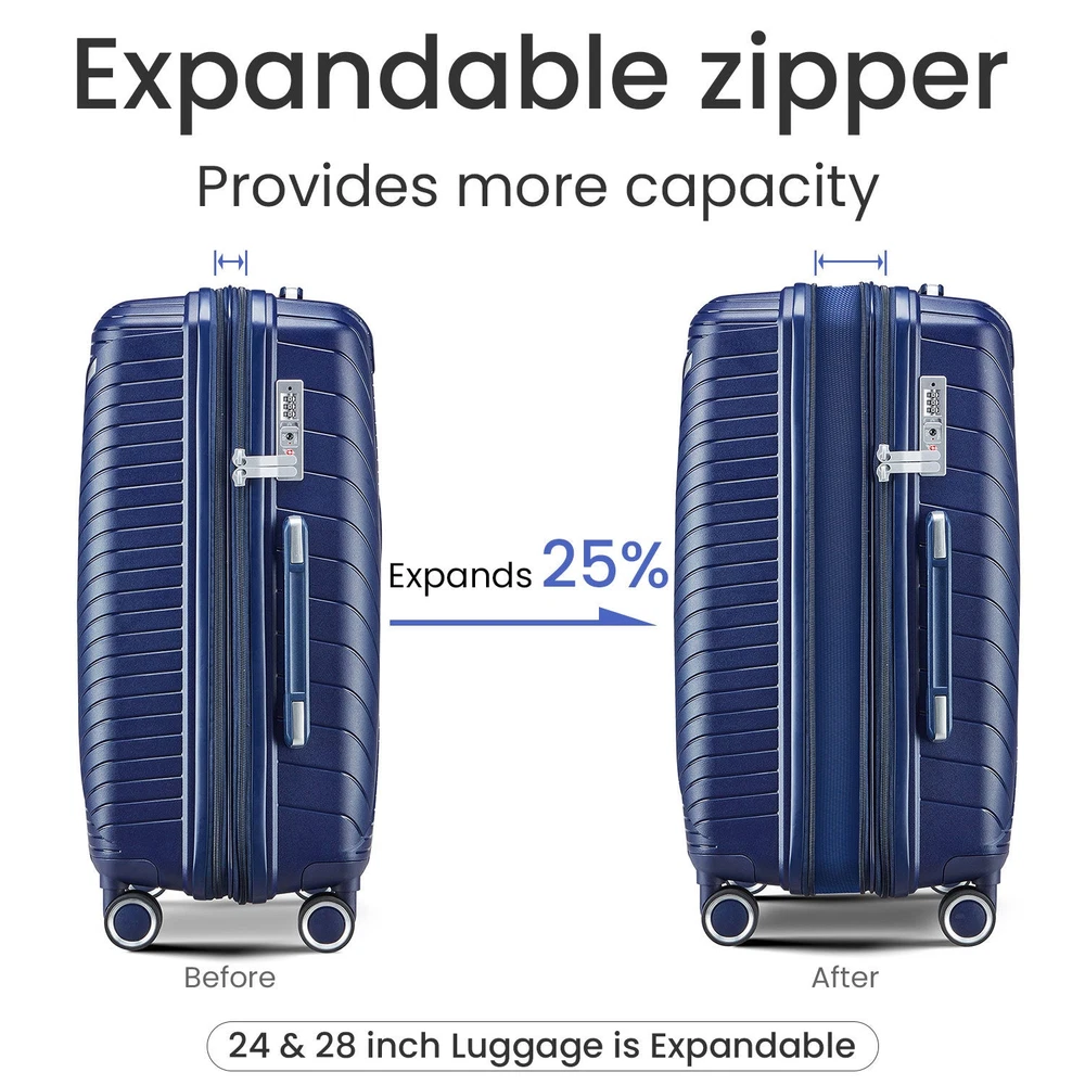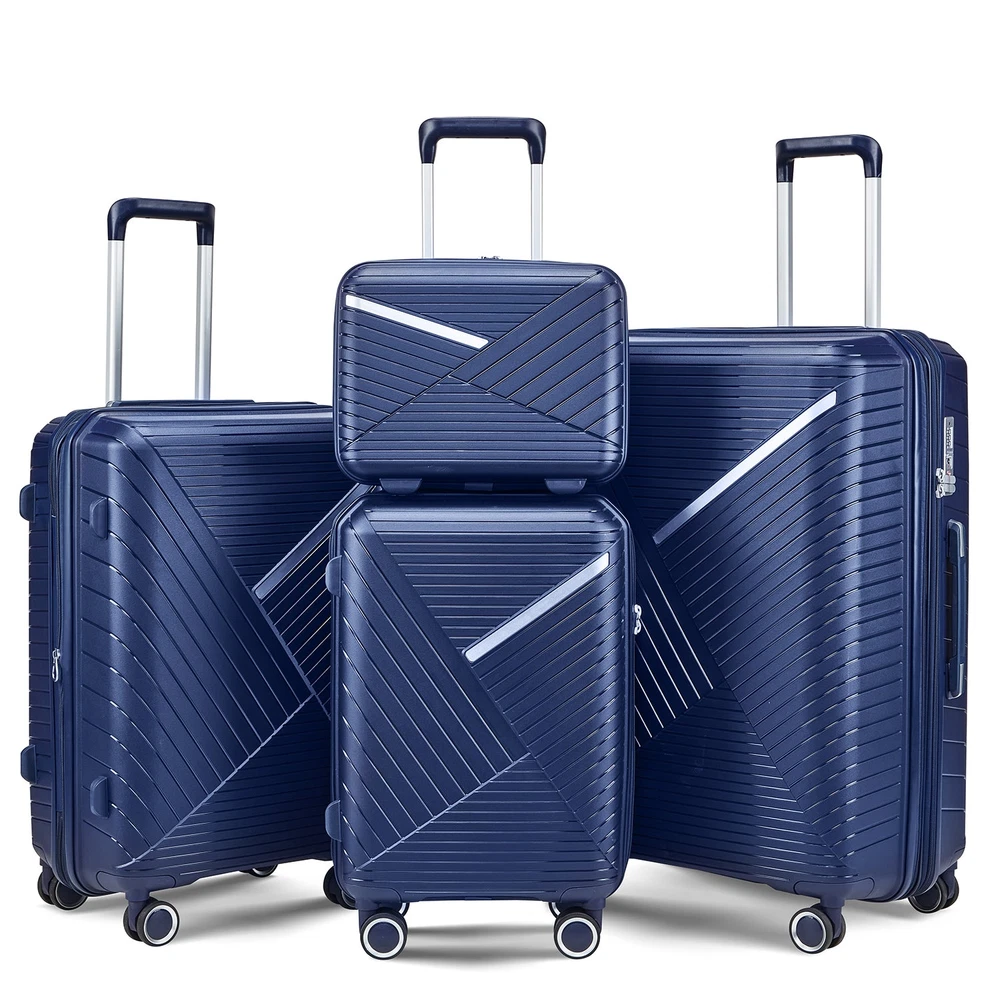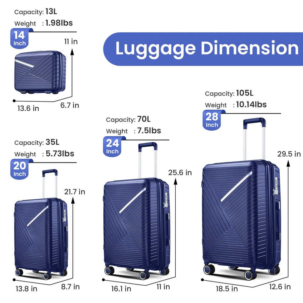 Luggage Sets 4 Piece(14/20/24/28), Expandable Lightweight Suitcase with 4 Double 360 Degrees Mute Spinner Wheels PP Materials Durable TSA Lock Travel Luggage Specifications Place of Origin China Main Color Navy Blue Main Material Polypropylene Dangerous Goods #dangerFlag# Dimensions & Weights Assembled Length (in.) 18.30 Assembled Width (in.) 10.80 Assembled Height (in.) 29.00 Weight (lbs) 24.00 Product Features Lightweight & Durable: This family luggage is made of strong waterproof PP exterior and black lined interior, which is easy to clean and long-term use. In addition, it is light in weight and easy to carry. Four molded side feet keep the luggage