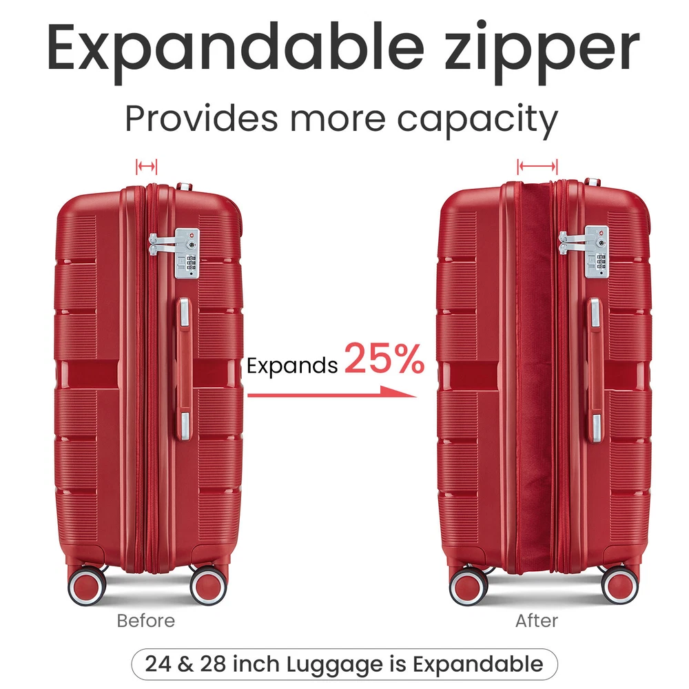 Specification Product Information Item Code:W2098P144470 Product Type:General Item Product Name:Luggage Sets 4 Piece(14/20/24/28) PP Lightweight & Durable Expandable suitcase Place of Origin:China Main Color:WINE RED Main Material:Polypropylene Product Dimensions Assembled Length (in.):18.30 Assembled Width (in.):10.80 Assembled Height (in.):29.00 Weight (lbs.):24.00 Package Size Length (in.):19.30 Width (in.):11.80 Height (in.):30.00 Weight (lbs.):26.50 Product Features Top quality luggage sets, PP material for hardshell, which makes the luggage more durable, lighter and impact-resistant. 20in is best for carry on, 24in and 28in expands 20% for more spaces. Organized and Spacious Interior. The fully lined luggage includes a handy divider and an interior organizer with zippered pocket for smaller items. Adjustable 3-level aluminum telescoping handle allows you to quickly maneuver in tight spaces and it's sturdier than most of the telescoping handle on the market. The top/side soft reinforced grip handles for easy carrying when in a hurry, or it can be really handy when lifting the suitcase with heavy weight. Side-mounted TSA LOCK with smooth YKK zipper act to deter theft, ensuring that only you or a TSA agent have easy access to your belongings when traveling, added security and convenience. Multi-directional spinner wheels to provide 360° effortless mobility and ease on traveler's wrist, re-engineered lightweight. Description