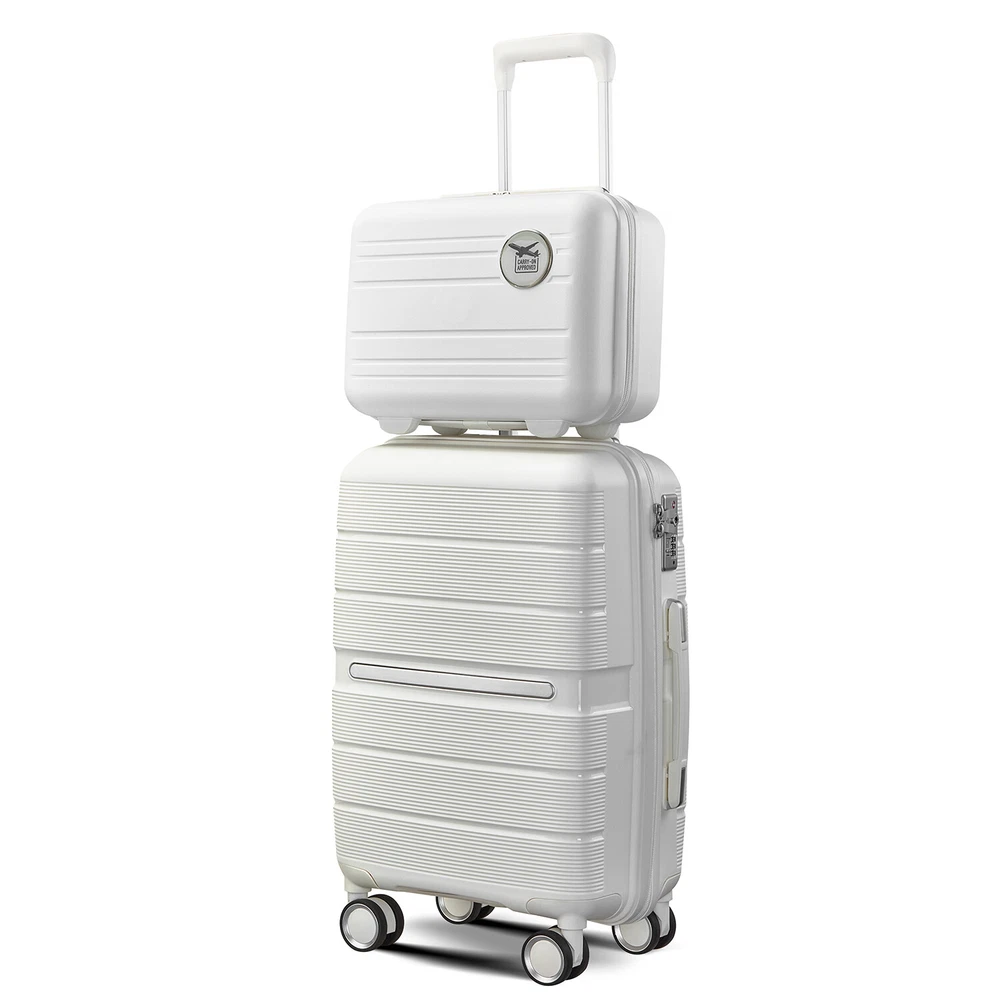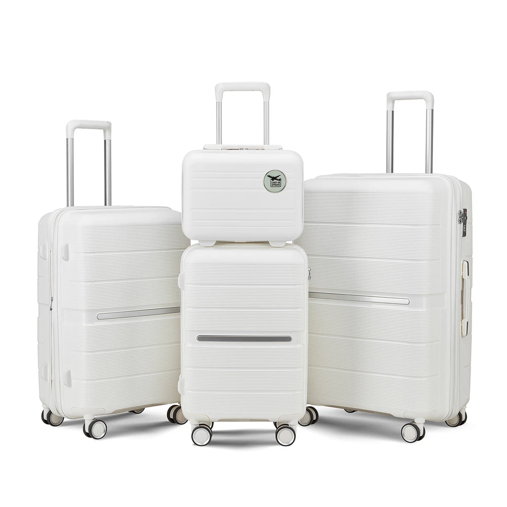 Specification Product Information Item Code:W2098126459 Product Type:General Item Product Name:Luggage Sets 4 Piece(14/20/24/28) PP Lightweight & Durable Expandable suitcase Place of Origin:China Main Color:White Main Material:Polypropylene Product Dimensions Assembled Length (in.):18.30 Assembled Width (in.):10.80 Assembled Height (in.):29.00 Weight (lbs.):24.00 Package Size Length (in.):19.30 Width (in.):11.80 Height (in.):30.00 Weight (lbs.):26.50 Product Features Top quality luggage sets, PC material for hardshell, which makes the luggage more durable, lighter and impact-resistant. 21in is best for carry on, 29in expands 20% for more spaces. Organized and Spacious Interior. The fully lined luggage includes a handy divider and an interior organizer with zippered pocket for smaller items. Organized and Spacious Interior. The fully lined luggage includes a handy divider and an interior organizer with zippered pocket for smaller items. Side-mounted TSA LOCK with smooth YKK zipper act to deter theft, ensuring that only you or a TSA agent have easy access to your belongings when traveling, added security and convenience. Multi-directional spinner wheels to provide 360° effortless mobility and ease on traveler's wrist, re-engineered lightweight. Adjustable 3-level aluminum telescoping handle allows you to quickly maneuver in tight spaces and it's sturdier than most of the telescoping handle on the market. The top/side soft reinforced grip handles for easy carrying when in a hurry, or it can be really handy when lifting the suitcase with heavy weight. Description