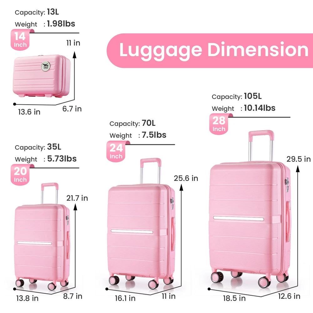 Specifications Place of Origin China Main Color Pink Main Material Polypropylene Dangerous Goods #dangerFlag# Dimensions & Weights Assembled Length (in.) 18.30 Assembled Width (in.) 10.80 Assembled Height (in.) 29.00 Weight (lbs) 24.00 Product Features Top quality luggage sets, PC material for hardshell, which makes the luggage more durable, lighter and impact-resistant. 21in is best for carry on, 29in expands 20% for more spaces. Organized and Spacious Interior. The fully lined luggage includes a handy divider and an interior organizer with zippered pocket for smaller items.