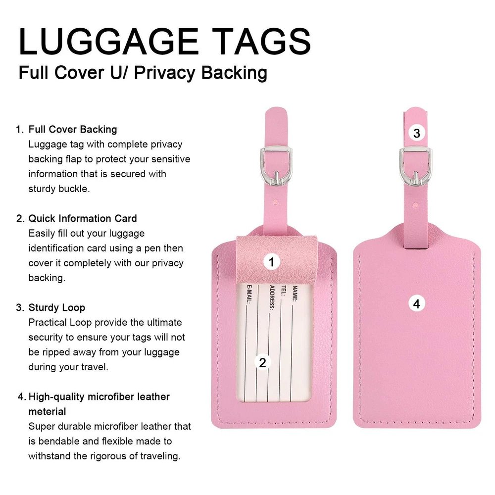 ✅ EXCELLENT MATERIAL QUALITY:Superior soft leather luggage tags, no smell, environmental. Exquisite stitching makes the tag durable. Adjustable durable strip, easy to attach and remove. And the belt connects your luggage and tags closely. The buckle is made of stainless steel .It’s very durable .Easy to hang on with buckle, prevent your luggage against loss. ✅ EASY TO IDENTIFY:Bright pink color helps you identify luggage and suitcase easily. With the stylish design, you will find your luggage quickly on the conveyor belt even though there are many same luggage. you don’t need to worried about others take your luggage by mistakes. ✅ PRIVACY INFORMATION COVER:Privacy back cover, that fully protect your information. You don’t worried about your information being read by others, as the flap will cover it. Leather luggage tag come with a cardboard, you can write your personal information. ✅ WATERPROOF:When you open the flap, there is a PVC surface above the card to avoid card moist. ✅ USAGE SCENARIOS: for business card, luggage, bags, briefcases, baby strollers, pet tags, keys, office ID tags etc. Packing:4 luggage tags.