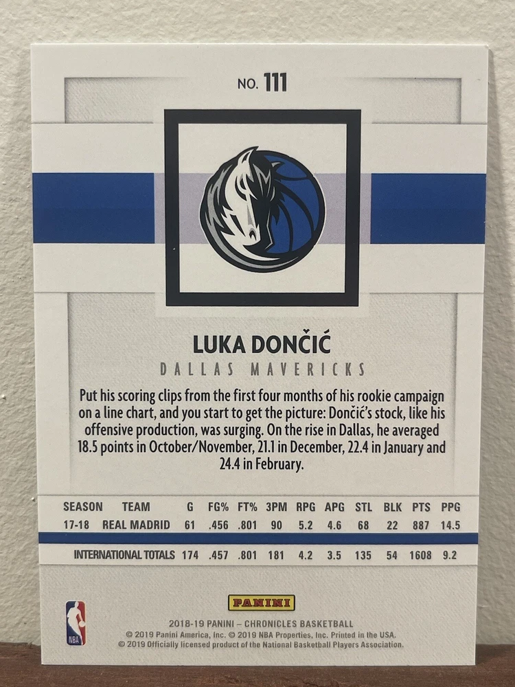 Secure shipping in Top Loader and Sleeve. This Luka Dončić rookie trading card from the Panini Chronicles is a must-have for any NBA fan or collector. Featuring the rising star of the Dallas Mavericks, this card is a great addition to any sports trading card collection. With its sleek design and high-quality printing, it's sure to be a standout piece in your collection. The card is from the National Basketball Association (NBA) league and is an officially licensed product from Panini. It's categorized as a sports trading card and is perfect for basketball enthusiasts. Whether you're a fan of Luka Dončić or are just starting your collection, this card is a great choice.