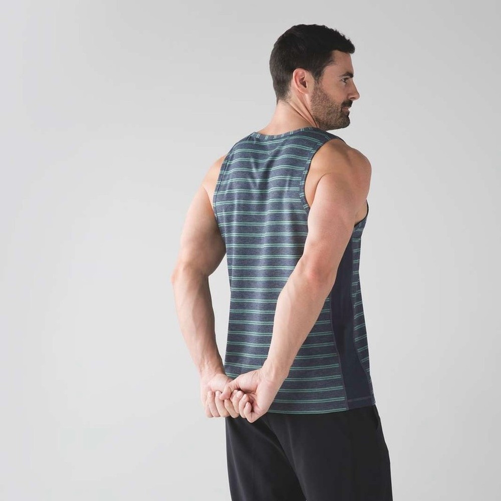 This tank top features a sleek design with alternating gray and green stripes, perfect for athletic activities. Made from lightweight fabric, it offers a comfortable fit and generous armholes for ease of movement. Ideal for workouts or casual wear, its cool color scheme adds a touch of style to any outfit. Condition: Good pre-owned condition. Logo shows wear. Comes from a smoke-free and pet-free home. **No size tag, but estimated to be about a size XL. Please see measurements below.** Approximate Measurements (Laying Flat): Length: 30 in Chest: 22.5 in Waist: 21 in For seller use: 8oz 2036