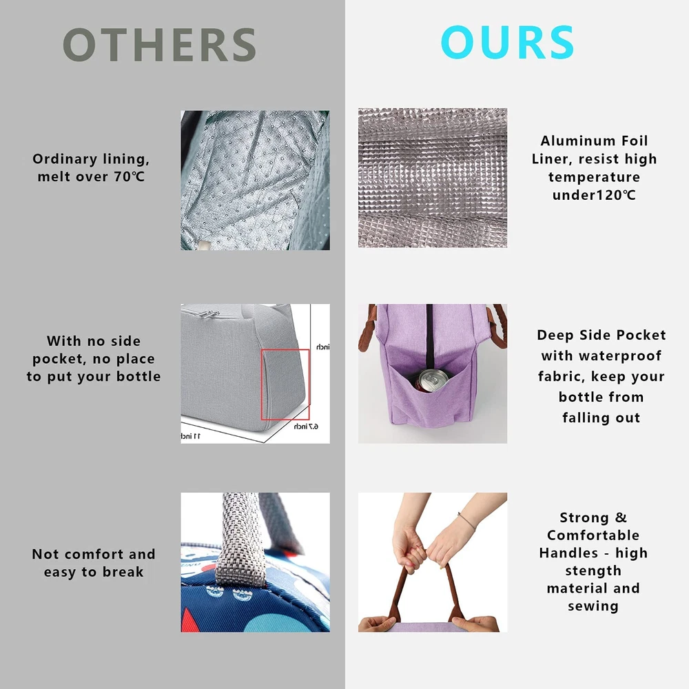 ❤LARGE CAPACITY: 9.85 x 6.5 x 9.85 (L x W x H)inch,10.3L, the main compartment is large enough to hold up 21 tins of sodas(330ml), enough room for packing your lunch and snacks for entire day. Besides, our lunch box features front container for utensils,napkins, keys and other essentials. And higher-designed side pockets for water bottle storage. ❤KEEP FRESH & WARM: This insulated lunch bag is made of water-resistant leakproof oxford cloth, easy clean food safe aluminum foil inner lining, and padded with thicken EPE foam will keep your food cold or thermal for 4-6 hours. Tips: Putting ice packs into the bag could keep cold for longer time. ❤MULTI-USE & CONVENIENCE: Collapsible Square design, Portable. Comes with a padded handles and smooth double zippers, our lightweight and simple stylish spacious tote is great to be used as a lunch bag, cooler tote, picnic bag for work, picnic, camping or any outdoor activities. ❤LONG-LASTING: Strong linen handles and heavy duty nylon connect by dense stitching can provide long-lasting against daily activities. Feel free to carry your food with this lunch bag and enjoy your lunch! ❤BUY WITH CONFIDENCE: If you are not satisfied with our lunch bag, we will offer you 30 days or . If any problem, please us via , we will reply you within 24 hours during working day. So buy it without any hesitation.