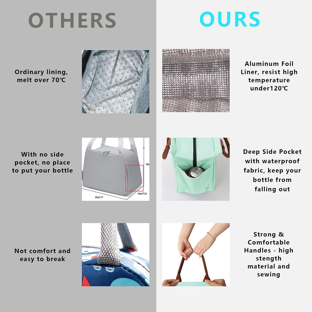 ❤LARGE CAPACITY: 9.85 x 6.5 x 9.85 (L x W x H)inch,10.3L, the main compartment is large enough to hold up 21 tins of sodas(330ml), enough room for packing your lunch and snacks for entire day. Besides, our lunch box features front container for utensils,napkins, keys and other essentials. And higher-designed side pockets for water bottle storage. ❤KEEP FRESH & WARM: This insulated lunch bag is made of water-resistant leakproof oxford cloth, easy clean food safe aluminum foil inner lining, and padded with thicken EPE foam will keep your food cold or thermal for 4-6 hours. Tips: Putting ice packs into the bag could keep cold for longer time. ❤MULTI-USE & CONVENIENCE: Collapsible Square design, Portable. Comes with a padded handles and smooth double zippers, our lightweight and simple stylish spacious tote is great to be used as a lunch bag, cooler tote, picnic bag for work, picnic, camping or any outdoor activities. ❤LONG-LASTING: Strong linen handles and heavy duty nylon connect by dense stitching can provide long-lasting against daily activities. Feel free to carry your food with this lunch bag and enjoy your lunch! ❤BUY WITH CONFIDENCE: If you are not satisfied with our lunch bag, we will offer you 30 days or . If any problem, please us via , we will reply you within 24 hours during working day. So buy it without any hesitation.