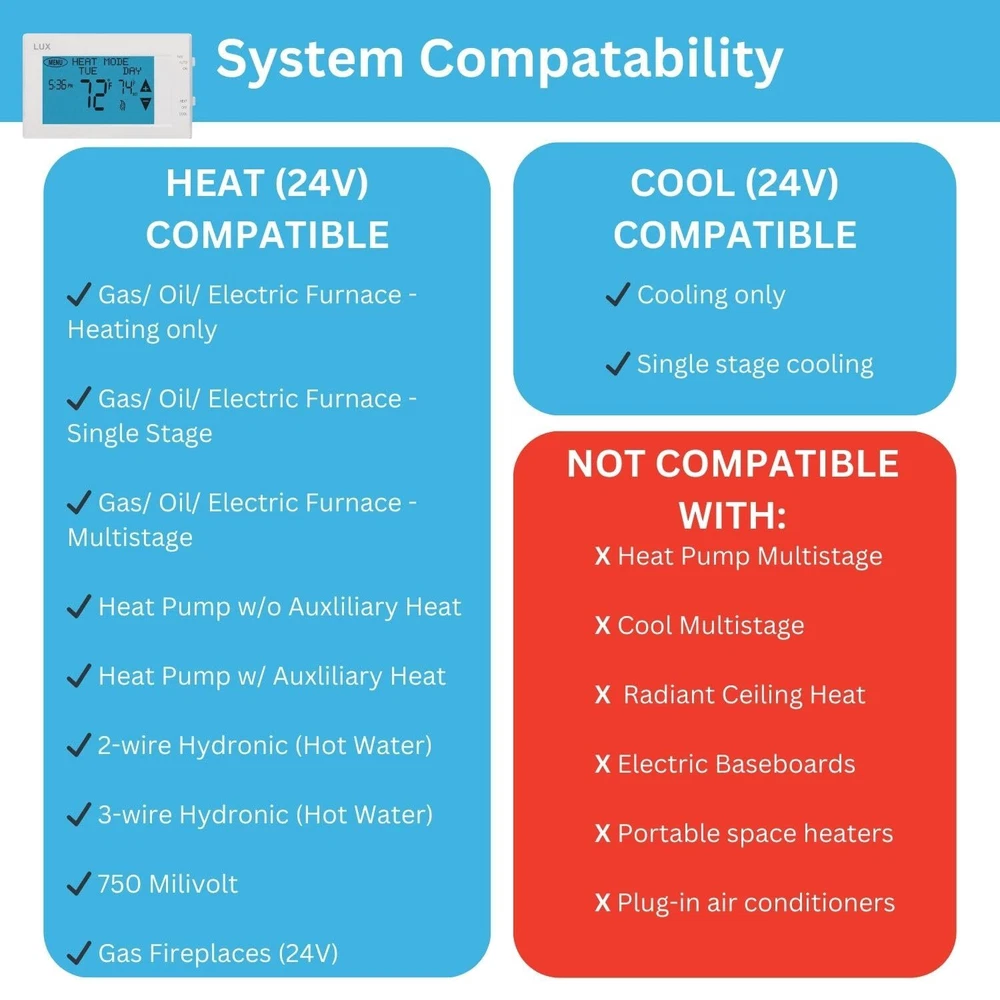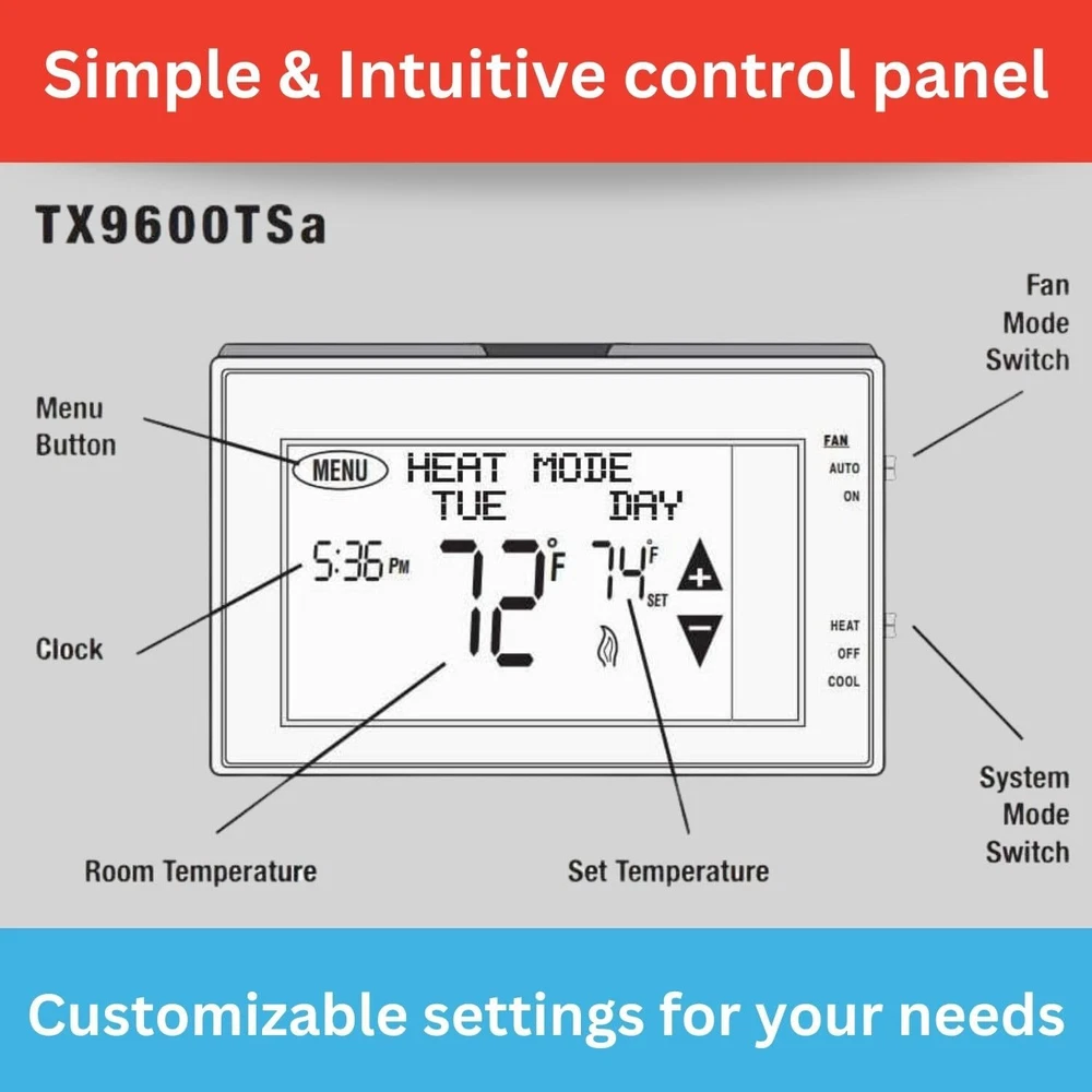 Easily adjust your temperature and create weekly schedules with the large touchscreen display, offering intuitive control powered by LUX technology Set energy-saving home & away temps; use hold settings for extended absences, maximizing efficiency & comfort Personalize your week with 7-day menu-driven programming, featuring 4 periods per day for tailored comfort and efficiency Easy to install and use, making temperature control simple and straightforward for anyone Backlit touchscreen display shows current and set point temperatures simultaneously, providing clear visibility day or night