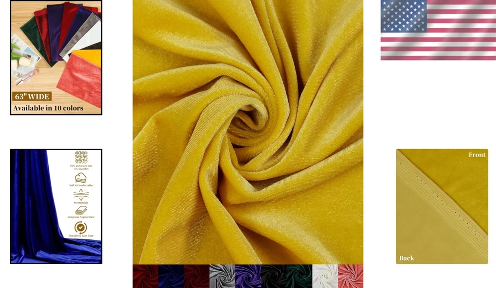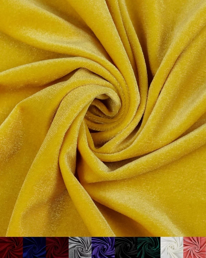Features: Four-Way Stretch, Excellent Stretch, Soft Texture, Machine Washable, Hand Sewable, No Fraying Width: 63" Fabric Weight: Medium Size: 5 Yard gtin13: Does not apply Material: Velvet Color: Yellow Fiber Content: Polyester, Spandex Product Dimensions: 3.94 X 3.94 X 0.79 Inches; 3.99 Pounds Item Form: Cut By The Yard Suitable For: Apparel - Everyday Clothing, Costume, Crafts, Upholstery UPC: Does not apply Unit of Sale: Lot, Individual Pieces Fabric Type: Polyester,spandex,velvet Fabric Brand: Unbranded Handmade: No