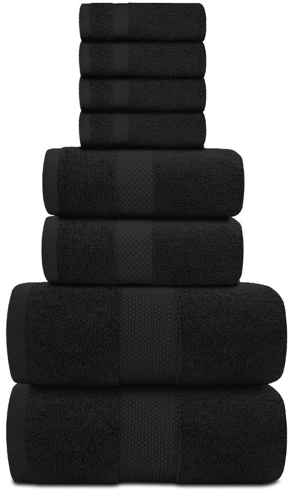 Soft and Absorbent The fluffy towel set is made super soft, plush and extra absorbent. The stylish border gives it a sophisticated and luxurious look. You will feel the softness immediately, and the towels will get softer after each washing. And by using only 100% Combed cotton and double-stitching all the hems the durability is un-equaled. These towels should last you many years! Set Contains 2 Bath Towels: 27-inch x 54-inch 2 Hand Towels: 16-inch x 30-inch 4 Washcloths: 13-inch x 13-inch Easy to UseThese towels are machine washable. Tumble dry low for drying. Always follow care instructions written on label for best results. Hotel Collection - 8-Piece bathroom towel set contains 2 bathroom towels (27 x 54 inches), 2 hand towels (16 x 30 inches), and 4 washcloths (13 x 13 inches); Each towel is spun from 100% turkish cotton - durable, quick-dry, and wonderfully absorbent Wrap Into Blissful Luxury - At the end of a long day, or at the start of a new one, you deserve a little luxury; Transform your bathroom into a mini spa with the help of deliciously soft, comfy elegant bath towels set True Luxury and Super Soft Feel Every Time - The surface is smooth and not easy to shed, adding to our bath towel sets durability; Edges are reinforced with double needle embroidered stitching to prevent fraying from long-term use and laundering Highly Absorbent, Fast Drying, No Lint - Our plush towels and washcloths sets, made from top-grade turkish cotton, boast exceptional absorbency and quick-drying features, complemented by a lint-free experience Easy Maintenance - These cotton towels for bathroom are hassle-free to maintain – simply machine wash them; They fluff up nicely and become even softer after the first wash, with minimal lint release that does not affect their aesthetics, functionality