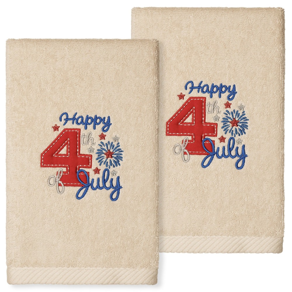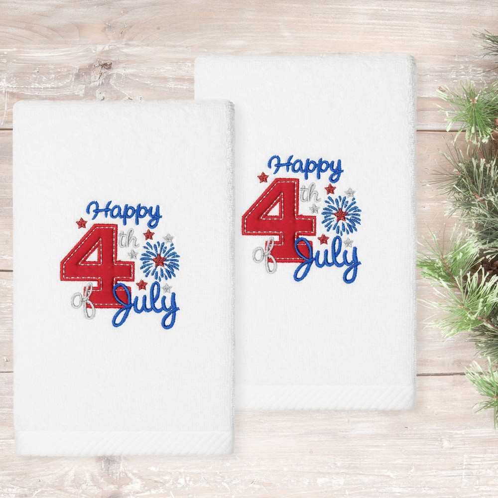 Bring a patriotic spirit to your bath décor with the "4th of July" embroidered hand towels. These towels feature a lustrous satin applique and glittering fireworks. This special & luxurious terry hand towel is manufactured with the finest Turkish cotton fiber for maximum softness and absorbency.Embroidered 4th of July Design100% Genuine Turkish CottonMachine wash cold, no bleach, line dry or dry cleanSet includes 2 embroidered hand towels (16" x 30")Made in TurkeyProudly Embellished in USA Free Shipping Over $49.99* Details Authentic Hotel and Spa 4th of July - Embroidered Luxury 100% Turkish Cotton Product Description: Bring a patriotic spirit to your bath décor with the "4th of July" embroidered hand towels. These towels feature a lustrous satin applique and glittering fireworks. This special & luxurious terry hand towel is manufactured with the finest Turkish cotton fiber for maximum softness and absorbency. Embroidered 4th of July Design 100% Genuine Turkish Cotton Machine wash cold, no bleach, line dry or dry clean Set includes 2 embroidered hand towels (16" x 30") Made in Turkey Proudly Embellished in USA