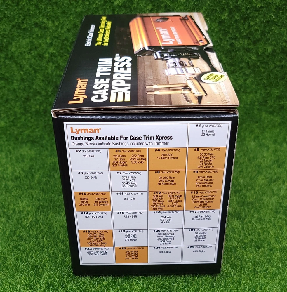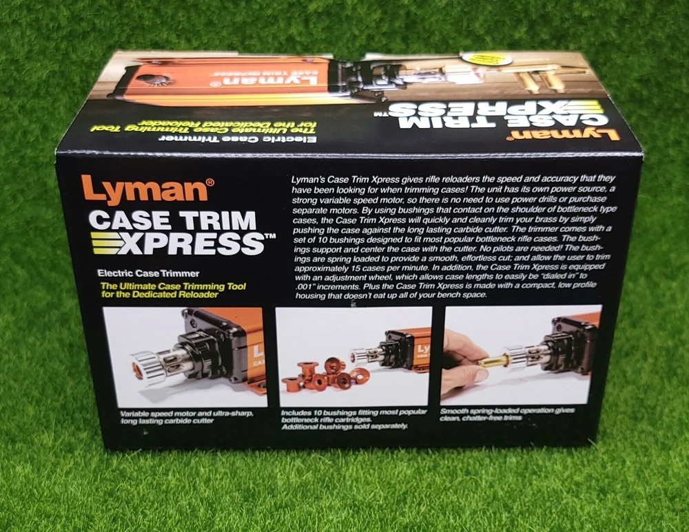 Lyman Brass Smith Case Trim Xpress 115V Reloading Electric Case Trimmer #7862015 Description: Lyman’s Case Trim Xpress gives rifle reloaders the speed and accuracy that they have been looking for when trimming cases! The unit has its own power source, and a strong variable speed motor, so there is no need to use power drills or pur- chase separate motors . By using bushings that contact on the shoulder of bottle neck type cases, the Case Trim Xpress will quickly and cleanly trim your brass by simply pushing the case against the long lasting carbide cutter . The trimmer comes with a set of 10 bushings (in orange type below) designed to fit most popular bot- tleneck rifle cases . The bushings support and center the case with the cutter . No pilots are needed! The bushings are spring loaded to provide a smooth, effortless cut; and allow the user to trim approximately 15 cases per minute . In addition, the Case Trim Xpress is equipped with an adjustment wheel, which allows case lengths to easily be “dialed in” to .001” increments . Plus the Case Trim Xpress is made with a compact, low profile housing that doesn’t eat up all of your bench space. Features: Fast and accurate trims – approximately 15 cases per minute Variable speed motor and ultra-sharp, long lasting carbide cutter Utilizes case shoulders to center & trim(Not for use on straight wall cases) Comes with 10 bushings fitting most popular bottleneck rifle cartridges Smooth spring-loaded operation gives clean, chatter-free trims Compact, low profile design uses minimal bench space No pilots needed
