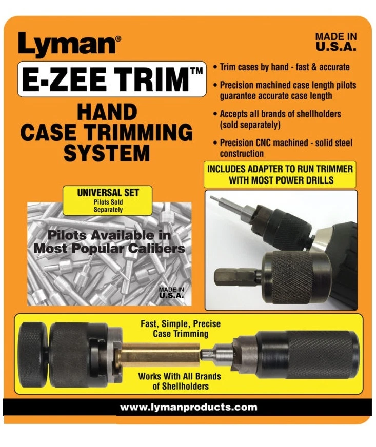 E-ZEE TRIM Hand Case Trimmer Universal Set 7821890 NEW! Metallic cases stretch as a result of both the firing process and the subsequent resizing process. When your cases reach a certain dimension, the original case length must be restored through trimming. The Lyman E-ZEE TRIM case trimmer allows for the user to have a precision trimmer with interchangeable caliber specific pilots. The length is preset for each caliber so no measuring is required. Just select the proper caliber pilot and begin trimming. A power adapter is included to connect the hand trimmer to an electric drill for larger amounts of trimming. Every kit includes a case locking device, cutter, trim-to length pilot, cutter head, and the power adapter. The case locking device requires the use of standard shell holders sold separately. The quick assembly will have you trimming cases in seconds. The only thing needed other than the E-ZEE TRIM Universal set is the proper E-ZEE Trim Pilot and standard shell holder for the caliber you are wanting to trim (both sold separately) . Lyman is one of the most recognized names in reloading, producing innovative tools for serious shooters and reloaders. Offering products that get the job done while still offering value and advancing technology. Lyman uses its years of experience and user feedback to offer the best performing reloading tools available. ~~~~~~~~~~~~~~~~ ALL MANUFACTURERS WARRANTIES WILL APPLY ! All of our products are BRAND NEW in the box; and contain all of the parts, materials and documentation. You can expect and will receive prompt delivery of your item. We will ship your order within ONE DAY! We are unable to accept returns on used, fitted, or altered parts. Returns must be in new, unused condition and in their original packaging.
