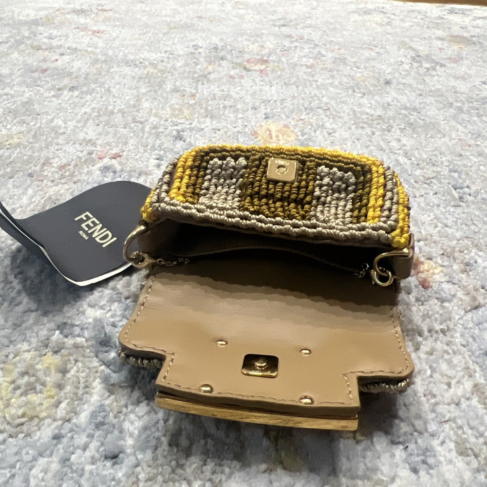 The M. Flap Bag/Baguette Woven Fabric by Fendi is a stylish and colorful card wallet designed specifically for women. This accessory features unique multicolor patterns and a sleek design perfect for keeping cards and cash organized in style. Made from high-quality materials, this wallet is a fashionable choice for any woman looking to add a touch of luxury to her everyday essentials. Comes with protective film on golden accents.