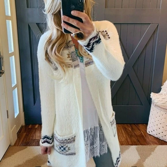 Cozy Boutique Labeled New Native Ethnic Print Soft Cardigan Boho Sweater + Open Front + Front Pockets + Oversized Cozy Fit + Acrylic Poly Blend Yarn + Model is 5'8" / 140 lbs and modeling a size Medium Ships fast from our studio in Washington State! Approx. Measurements: XL: Pit to pit: 24.5", Length: 38" ** Double pit to pit for total bust measurement Brand New With Tags! Combined Shipping Discount: Check out my other sweaters up for auction at up to 80% off retail! Each additional item purchased the same day ships for $1.00 each! Check out our other auctions: Check out my eBay Store! ** Bid With Confidence ** 20 Years on eBay with a Top Rated Status **