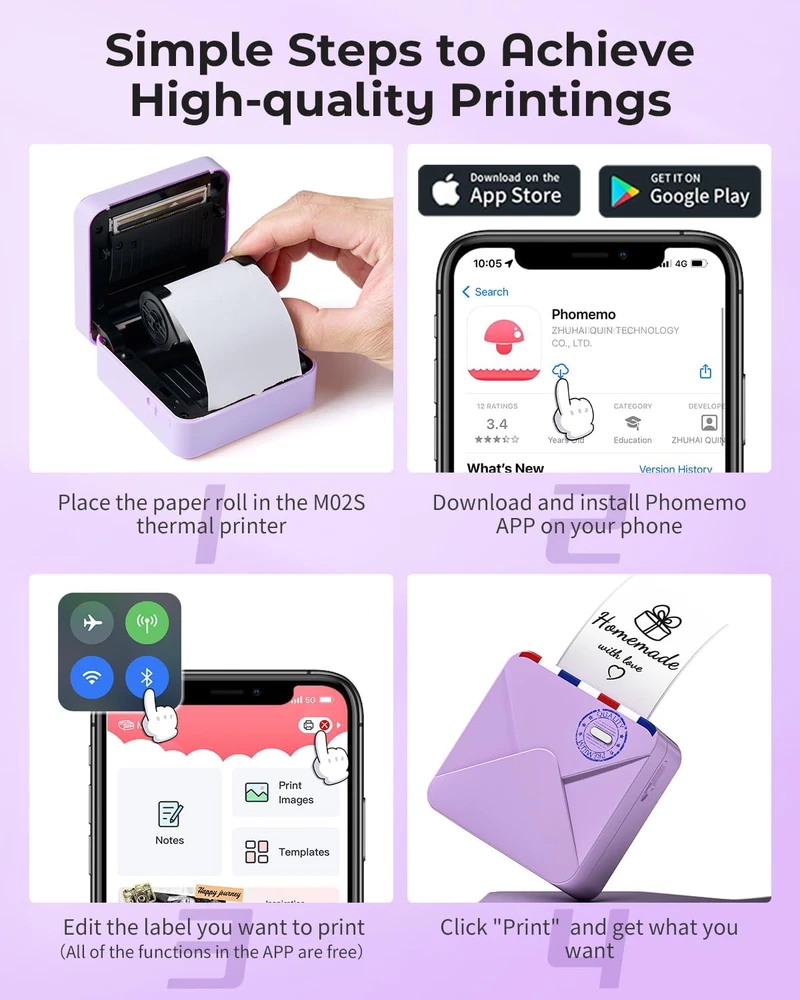 Store New Arrivals Add to Favorite View Feedback Contact M02S Pocket Mini Printer-Bluetooth Thermal Photo Mini Printer 300Dpi,Thermal Sticker Printer for Study Notes, Photo, Organization, Gift, Compatible with Ios and Android Description Item model number M02S Duplex Simplex Max copy resolution black-white 300 DPI Control Method App Warranty Type Limited Warranty Maximum Color Print Resolution 300 DPI Compatible Devices Smartphones Ink Color cyan, magenta, yellow Processor Count 1 Printer Ink Type Thermal Print media Labels, Glossy photo paper Dual-sided printing No Controller Type Android Maximum Black and White Print Resolution 300DPI Max Input Sheet Capacity 10 Printer Media Size Maximum 53mm Color Depth 24 bpp Resolution 300 x 300 Product Dimensions 2.22"D x 3.79"W x 4.56"H Model Name M02S Scanner Type Portable, Photo Hardware Interface Bluetooth Specific Uses For Product Study Notes, To-Do Lists, Office Documents, Photos, Labels, Stickers, Scrapbooking, Crafting Included Components Labels Additional Printer functions Print Only Model Series M02S Country of Origin China Display Type LCD Item Weight 11.3 ounces Connectivity Technology Bluetooth Special Feature Lightweight,Portable,Wireless Printing Technology Thermal Sheet Size 53mm Color purple Max copy resolution color 300 DPI Max Printspeed Monochrome 20.00 Number of Drivers 1 Printer Output Monochrome Batteries 1 Lithium Ion batteries required. (included) Maximum Print Speed (Color) 1.00 [Superior 300DPI Printing]--- Experience stunning 300dpi HD printing quality with the M02S pocket mini printer, ensuring your study notes, photos, and artwork come to life with unparalleled clarity and detail [Small but Multifunctional]--- M02S sticker photo printer allows you to print study notes, to-do lists, office documents, and more—all from the palm of your hand (size 3.3*3.3*1.6inch).Unleash your inner artist with the M02S's user-friendly interface App, making it easy to create personalized labels, stickers, and artwork that reflect your unique style [iOS & Android Device Bluetooth Connectivity]--- Enjoy seamless printing from your iOS or Android device with the M02S thermal sticker printer's Bluetooth connectivity, eliminating the need for cumbersome cables and connectors [Versatile Print Sizes]--- Unlock limitless creative possibilities with the M02S pocket mini printer's compatibility with 3 different paper sizes (53mm, 25mm, 15mm), allowing you to print everything from small labels to large photos with ease. Seamlessly switch between print sizes to suit your needs, whether you're organizing your home, crafting personalized gifts, or capturing cherished memories [Inkless Printing]--- Say goodbye to expensive ink cartridges and messy refills. M02S sticker maker machine printer's thermal printing technology uses heat to create crisp, clear prints without the need for ink. Enjoy no ink printing with the M02S's inkless printing technology [What's in the Package]--- M02S thermal sticker mini printer*1, Thermal sticker roll*1, Label roll holder*1, User Manual*1,USB Cable for Charging*1 Product Description M02S Mini Printer---Meets Your Multiple Needs M02S Upgraded Mini Thermal Printer Print Clarity Upgraded from 203dpi to 300dpi The higher DPI can greatly improve the print out. Not only can you print labels/notes/to-do lists, but you can also print photos more clearly! Envelope Appearance Upgrade The upgraded appearance of the envelope makes the mini printer more suitable for daily use, and the beautiful appearance is also a good choice as a gift for family/children/friends/mothers There are tons of templates/icons/fonts , etc. for you to choose from inside the app for label editing, in addition, there are also very useful functions, such as scanning and printing , printing past edited labels , and so on! 1 For Photos 2 For Family Playing 3 For Memories 4 For Learning Say Goodbye to Skewed Printing The width of the paper roll holder is 15MM-53MM , you can adjust it by yourself. (*Paper roll holder is included in the package) 1 Simple Structural Design 2 4 Steps to Load Paper 3 4 Steps to Print Stickers ABOUT US We offer the best prices around on high quality products. Our E-store includes media such as books, movies, music and games while offering electronics, toys, sporting apparel, clothing, tools, general home, garden items and more. SHIPPING We are always working hard to ensure your package arrives as soon as possible. Please understand that some factors like weather, high postal traffic, and the perfo