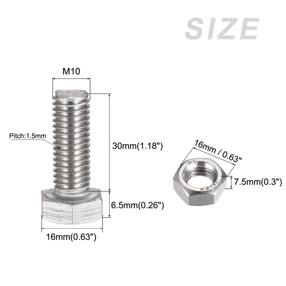 Document APPLY TO - Can be used in house construction and maintenance, machinery assembly, home furniture and appliance, DIY handmade project, etc.SPECIFICATION:Material: 304 Stainless SteelThread Size: M10x30mmThread Pitch: 1.5mmHex Head Size: 16x6.5mm/0.63"x0.26"(W*T)Nut Size: 16x7.5mm/0.63"x0.3"(W*T)Flat Washer Size: 20x2mm/0.79"x 0.08"(OD*T)Lock Washer Size: 16x2.5mm/0.63"x0.1"(OD*T)QUANTITY INCLUDED - 4sets x Bolts, Nuts, Flat & Lock Washers KitsADVANTAGE - Made of 304 stainless steel material which is durable and sturdy. It is anti-rust, anti-corrosion and can be fastened for a long time.Note: Please confirm the size of each component before buying it. Hex Head Screws Bolts, Nuts, Flat & Lock Washers Kits (M10x30mm) 4Sets APPLY TO - Can be used in house construction and maintenance, machinery assembly, home furniture and appliance, DIY handmade project, etc. SPECIFICATION: Material: 304 Stainless Steel Thread Size: M10x30mm Thread Pitch: 1.5mm Hex Head Size: 16x6.5mm/0.63"x0.26"(W*T) Nut Size: 16x7.5mm/0.63"x0.3"(W*T) Flat Washer Size: 20x2mm/0.79"x 0.08"(OD*T) Lock Washer Size: 16x2.5mm/0.63"x0.1"(OD*T) QUANTITY INCLUDED - 4sets x Bolts, Nuts, Flat & Lock Washers Kits ADVANTAGE - Made of 304 stainless steel material which is durable and sturdy. It is anti-rust, anti-corrosion and can be fastened for a long time. Note: Please confirm the size of each component before buying it. Hot Item Payment 1.We accept eBay payment . 2.Payment must be received within 7 business days of auction closing. Shipping 1.We ship to your eBay or Paypal address. Please make sure your eBay and Paypal address is correct before you pay. 2.Items will be shipped within 1-3 business day when we received payment. 3.Delivery time depends on destination and other factors. Description Policy Hex Head Screws Bolts, Nuts, Flat & Lock Washers Kits (M10x30mm) 4Sets APPLY TO - Can be used in house construction and maintenance, machinery assembly, home furniture and appliance, DIY handmade project, etc. SPECIFICATION: Material: 304 Stainless Steel Thread Size: M10x30mm Thread Pitch: 1.5mm Hex Head Size: 16x6.5mm/0.63"x0.26"(W*T) Nut Size: 16x7.5mm/0.63"x0.3"(W*T) Flat Washer Size: 20x2mm/0.79"x 0.08"(OD*T) Lock Washer Size: 16x2.5mm/0.63"x0.1"(OD*T) QUANTITY INCLUDED - 4sets x Bolts, Nuts, Flat & Lock Washers Kits ADVANTAGE - Made of 304 stainless steel material which is durable and sturdy. It is anti-rust, anti-corrosion and can be fastened for a long time. Note: Please confirm the size of each component before buying it. Hot Item Payment 1.We accept eBay payment . 2.Payment must be received within 7 business days of auction closing. Shipping 1.We ship to your eBay or Paypal address. Please make sure your eBay and Paypal address is correct before you pay. 2.Items will be shipped within 1-3 business day when we received payment. 3.Delivery time depends on destination and other factors.