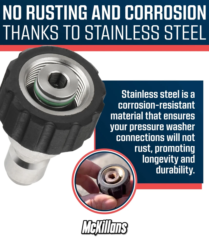 **READ** Please verify you have an M22-14mm hose prior to purchasing. The male adapters have a plug with a diameter of 14mm, not 15mm. Therefore, it is not compatible with electric pressure washers from: Sun Joe, AR Blue, Simoniz and more. If your washer requires a 15mm fitting, using this fitting will cause leaks. Compatible with all gas powered pressure washers with M22 connectors ✅ The Complete Solution: Every connector and adapter you need to convert all your connects on your pressure washer to full stainless quick connects, in one kit. ✅ Smooth Operation: The corrosion resistant stainless steel helps ensure smooth operation of the connects. ✅ Machined in Stainless Steel: Every connector is made out of 304 medical grade stainless steel, which does not rust or tarnish. ✅ Upgraded O-Rings: Made from Viton, a temperature and chemical resistant rubber compound, and much more robust than traditional o-ring materials. ✅ What's included: - M22-14mm male plugs (QTY 2) - M22-14mm female (QTY 2) - 2 male garden hose plugs (QTY 2) - 2 female garden hose QC (QTY 2) ✅ Compatibility: All gas pressure washers use standard M22-14mm hoses. Some electric pressure washers like SunJoe, AR Blue, and Active VE52 use M22-15mm hoses which will not work with this kit.
