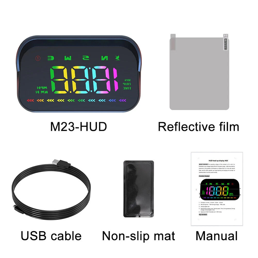 Product Description M23 Color Head-Up Display GPS Speedometer Windshield Projection Speed Warning M23 Color Head-Up Display GPS Speedometer Windshield Projection Speed Warning Features: 1. Heads UP Display for Cars full automatic sensitivity, no need to manually adjust, adaptive adjustment of brightness, clear enough during the day, not blinding at night. 2. Can be projected onto the windshield, with colorful large fonts clearly visible. Drivers don't need to look down to see the important information they need, reducing the frequency with which drivers need to look down to check their gauges, avoiding interruptions in concentration and loss of perception of the state they are in, and improving driver safety. 3. Driving at night has always been a concern for drivers, but the integrated design of this hud hood covers the excess light from the head-up display, so that driving at night is not blinding, and it can also automatically adjust the display according to the intensity of the outside world. Even in the dark night HUD light machine has a soft light, no background light transmission. Able to present a perfect transparent display of information. 4. The M23 color version GPS speedometer for cars displays speed, compass, travel time, and distance, and also has overspeed alarm and automatic light sensing functions. The speed is measured in miles per hour and kilometers per hour and can be adjusted in the settings. When speeding, the product will emit a beeping sound and flash to remind the driver, just like a safety supervisor, always reminding the driver to pay attention to driving safety. Specification: Condition: Brand New (Never Been Used or Installed) Material: High Quality ABS+PC Color: Black Fitment Type: Performance/Custom Placement on Vehicle: Front Voltage: USB 5V Model: M23 Fitment: Suitable for all car models, such as new energy vehicles, gas-electri hybrid vehicle, fuel car, bus, truck, etc. Please kindly check our item description, sizes and photos, make sure this item fit for your car. Packing Included: 1 Pcs HUD 1 Pcs Refective Film 1 Pcs USB 1 Pcs Non-slip mat 1 Pcs Manual Notes: 1. No installation instruction included, professional installation is highly recommended. 2. There may be slight size deviations due to manual measurement, different measuring methods and tools. 3. The real color of the item may be slightly different from the pictures shown on website caused by many factors such as brightness of your monitor and light brightness. 4. Fitted photos just for your reference, which to show the installation effect and show you which model car can be installed, the actual product is same as the detail photos, please also check the other photos carefully. 5. This device is a GPS digital speedometer, and the speed is collected from satellites. So if you test it at home or in a parking lot, the speed may not be displayed correctly. Please test it outside the car with a good signal. Payment Shipping Returns Contact Us Feedback 1.We accept Payoneer、PayPal、Mastercard、VISA 、AMEX etc. 2.All major credit cards are accepted through secure payment processor. 3.For faster service, please update your correct address before sending payment. 1. We ship to your eBay or Paypal address. Please make sure your eBay and Paypal address is correct before you pay. 2. Items will be shipped within 2-5 business days when we received payment.(exclusive holidays or weekends) 3. Import duties, taxes and charges are not included in the item price or shipping charges. These charges are the buyer responsibility.Please check with your country customs office to determine what these additional costs will be prior to bidding/buying. 4. Delivery time depends on destination and other factors, normally it would sooner than the ETA if it can go smoothly through customs. Our Promise : 30-Day Returns(No Reason/Just Don't Like it/Change Mind) : Unused/uninstalled items in original packaging can be returned (seller covers return shipping). Make return Easier Defective/Damaged Items : Contact us within 24 hours of delivery . We cover return shipping and offer a full refund or replacement. Do not open a return request! Wrong /Missing Items/Not as described : Provide photo evidence, and we’ll reship within 48 hours. Do not open a return request! Doesn't fit your vehicle : message us details and your car/vehicel info, will find the compatible one or refund. Do not open a return request! ⚠️ Important : Always contact us first via eBay Messages . Do not open a return request! We respond within 24 hours (weekdays). Unresolved issues without prior communication may delay resolution. Thank you for understanding! 1.For any inquires and customer support, please contact us by ebay message. 2.All emails will be responded to within 24 hours during business days.(except holidays or weekends) 3.We are always on your sides! Appreciate your kindly understanding and cooperation. Hope you have an excellent shopping experiences with our transactions. 1. If satisfied, please leave a 5-star review to support our store. Our Positive feedback will be left to you automatically after payment cleared. 2. If unsatisfied, Do not leave any feedback and contact us by ebay message to get problem solved . We’ll response within 1 working day! 3. We are 100% will to solve any problem caused by the transaction, Anytime Netrual or Negative Feedback before communication by ebay message is not acceptable! Payment 1.We accept Payoneer、PayPal、Mastercard、VISA 、AMEX etc. 2.All major credit cards are accepted through secure payment processor. 3.For faster service, please update your correct address before sending payment. Shipping 1. We ship to your eBay or Paypal address. Please make sure your eBay and Paypal address is correct before you pay. 2. Items will be shipped within 2-5 business days when we received payment.(exclusive holidays or weekends) 3. Import duties, taxes and charges are not included in the item price or shipping ch