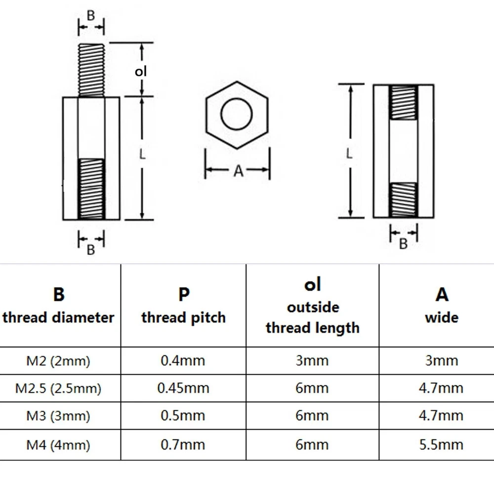 There are 10/50pcs high quality metric thread brass hex spacer/ phillips head 304 stainless steel screws / hex 304 stainless steel nuts Description: Material: brass(male-female spacer / female-female spacer) 304 stainless steel(screw/nut) Size: Male-Female spacer : M2/2.5/3/4 * L(spacer length) + 3/6mm(outside thread length) Female-Female spacer : M2/2.5/3/4 * L(spacer length) Metric thread diameter: M2 (2mm) / M2.5 (2.5mm) / M3 (3mm) / M4 (4mm) Metric thread pitch: 0.4mm(M2) / 0.45mm(M2.5) / 0.5mm(M3) / 0.7mm(M4) Outside thread length: 3mm(M2) 6mm(M2.5 / M3 / M4) Spacer wide: 3mm(M2) 4.7mm(M2.5) 4.7mm(M3) 5.5mm(M4) Screw: M2/M2.5/M3/M4 * L(thread length) Metric thread diameter: M2 (2mm) / M2.5 (2.5mm) / M3 (3mm) / M4 (4mm) Metric thread pitch: 0.4mm(M2) / 0.4.5mm(M2.5) / 0.5mm(M3) / 0.7mm(M4) Nut: M2/M2.5/M3/M4 Metric thread diameter: M2 (2mm) / M2.5 (2.5mm) / M3 (3mm) / M4 (4mm) Metric thread pitch: 0.4mm(M2) / 0.4.5mm(M2.5) / 0.5mm(M3) / 0.7mm(M4) On Dec 14, 2024 at 21:44:22 PST, seller added the following information: