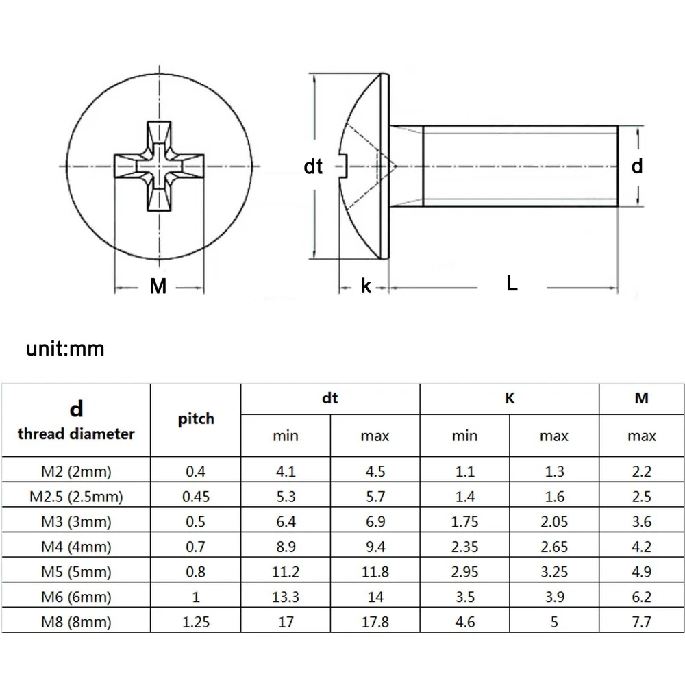 There are 10/50pcs high quality phillips truss head bolt Screw Description: Material:304 (A2-70) stainless steel Size: d(thread diameter) x L(thread length) Metric thread diameter: M1.6(1.6mm) / M2 (2mm) / M2.5(2.5mm) M3 (3mm) / M4 (4mm) / M5 (5mm) / M6 (6mm) / M8(8mm) Metric thread pitch: 0.35mm(M1.6) / 0.4mm(M2) / 0.45mm(M2.5) / 0.5mm(M3) 0.7mm(M4) / 0.8mm(M5) / 1mm(M6) / 1.25mm(M8) Thread length:3mm-80mm On Dec 14, 2024 at 23:16:48 PST, seller added the following information: