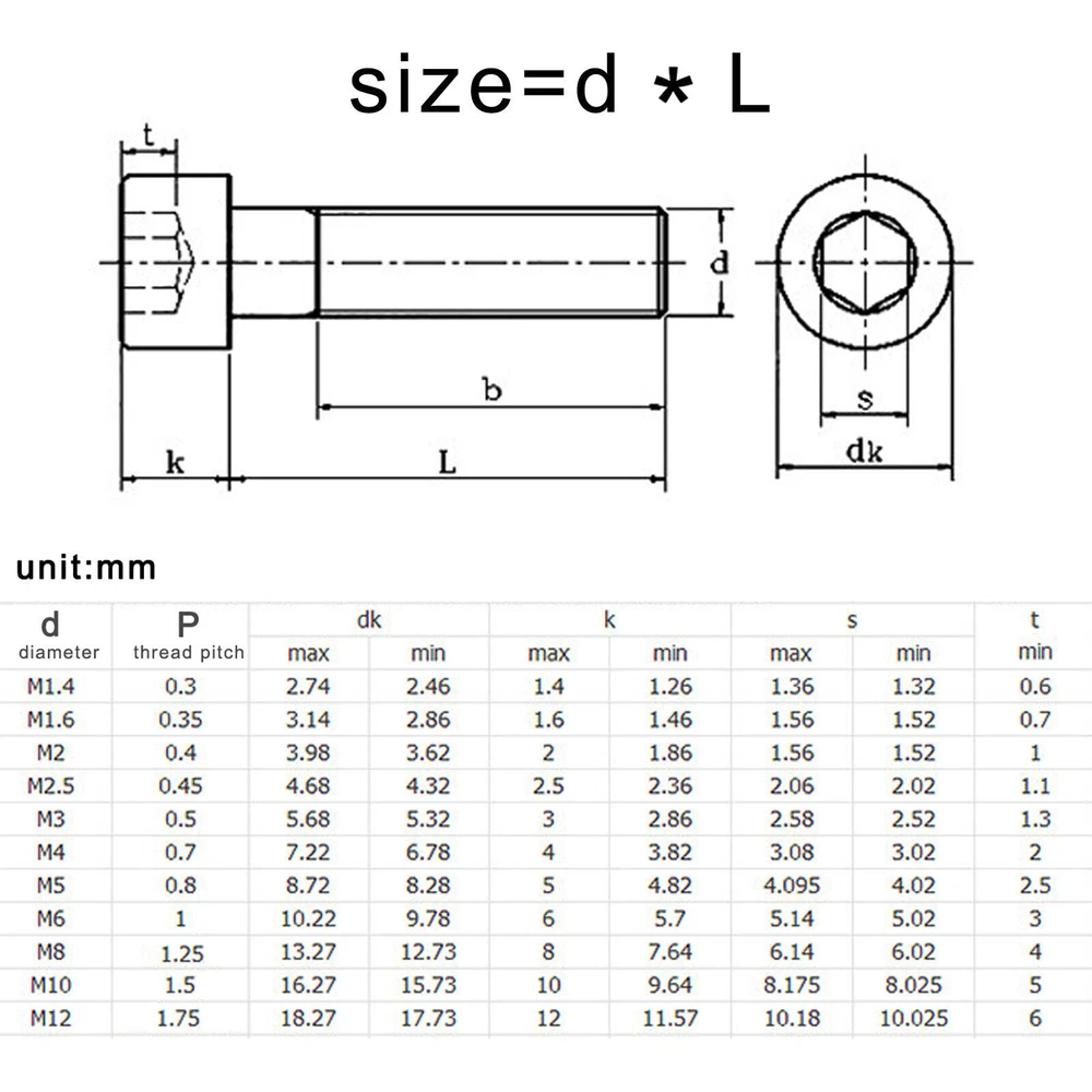 There are high quality 12.9 class steel cap head hex socket screw Material:12.9 class steel Size: D(thread diameter) x L(thread length) Kindly remind: most of the bolt is full thread,a small part of lengthened bolt are half thread in M3,when the thread longger than 25mm, it is part thread in M4,when the thread longger than 25mm, it is part thread in M5,when the thread longger than 25mm, it is part thread in M6,when the thread longger than 30mm, it is part thread in M8,when the thread longger than 35mm, it is part thread in M10,when the thread longger than 40mm, it is part thread in M12,when the thread longger than 50mm, it is part thread Metric thread diameter: M2 (2mm)/M2.5 (2.5mm)/M3(3mm)/M4 (4mm)/M5 (5mm) M6 (6mm)/M8 (8mm) /M10(10mm) / M12(12mm) Metric thread pitch: 0.4mm(M2)/0.45mm (M2.5)/0.5mm(M3) /0.7mm(M4)/0.8mm(M5) 1mm(M6)/1.25mm(M8) / 1.5mm (M10) /1.75mm (M12) Thread length: 10mm-250mm On Dec 14, 2024 at 20:16:34 PST, seller added the following information: