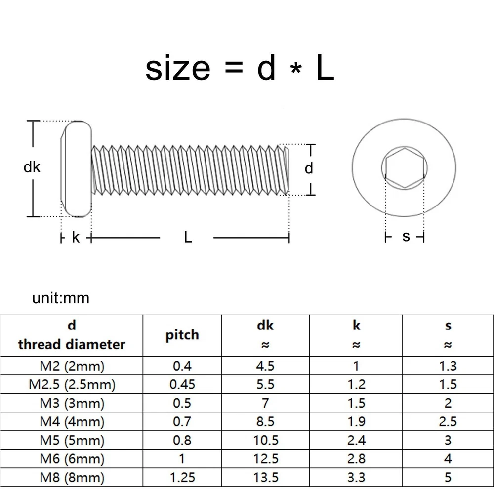 Material: 304(A2-70) stainless steel Size = D(thread diameter) x L(thread length) Metric thread diameter: M2(2mm) / M2.5 (2.5mm) /M3 (3mm) / M4 (4mm) / M5 (5mm) / M6 (6mm) / M8(8mm) Metric thread pitch: 0.4mm (M2) / 0.45mm (M2.5) /0.5mm(M3) / 0.7mm(M4) / 0.8mm(M5) / 1mm(M6) / 1.25mm(M8) On Dec 14, 2024 at 21:44:27 PST, seller added the following information: