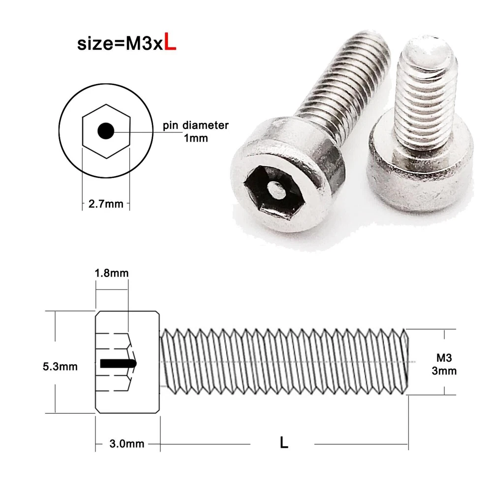 There are 10/20/50pcs high quality hex socket pin cap head bolt Material:304 (A2-70) stainless steel Size: M3 x L(thread length) Thread diameter: M3(3mm) Thread pitch: 0.5mm(M3) Hex socket wide: 2.7mm Pin diameter: 1mm Thread length: 6mm-22mm On Dec 14, 2024 at 21:44:23 PST, seller added the following information: