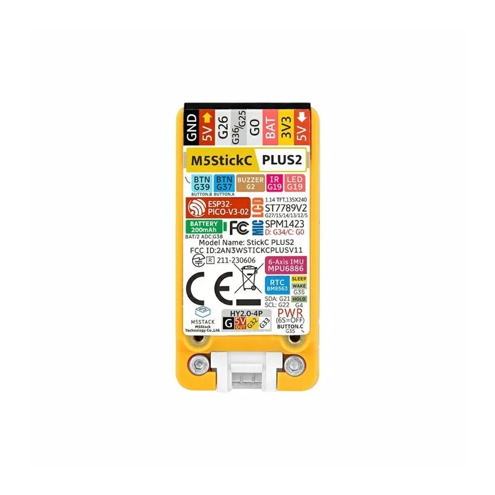 Specifications Hign-concerned Chemical None Type other is_customized Yes Model Number M5StickC Plus2 Current Type DC Description Original M5StickC PLUS2 Description M5StickC PLUS2 is an iterative version of M5StickC PLUS, featuring the ESP32-PICO-V3-02 chip as the main controller with built-in WiFi functionality. The compact device integrates a wealth of hardware resources within its small form factor, including infrared, RTC, microphone, LED, IMU, buttons, buzzer, and more. It boasts a 1.14-inch TFT screen with a resolution of 135*240, driven by the ST7789V2. The battery capacity has been increased to 200mAh, and the interface also supports HAT and Unit series products. This compact and versatile development tool is designed to spark limitless creative possibilities. M5StickC PLUS2 facilitates the rapid prototyping of IoT products, streamlining the entire development process. Even beginners in programming can easily build interesting applications and apply them to real-life scenarios using M5StickC PLUS2. Features ESP32-PICO-V3-02-Base,support WiFi Built-in 6-Axis IMU IR transmitter Microphone RTC Buttons, LCD(1.14 inch) Built-in Lithium Polymer Battery@200mAh Extendable Socket Built-in Passive Buzzer Wearable & Wall mounted Compatible with multi-platform development: UIFlow MicroPython Arduino NET nanoFramework Applications Internet of things terminal controller Wearable devices Stem education product DIY creation Specification ESP32: ESP32-PICO-V3-02, 240MHz dual core, support wifi, 2 MB SPI PSRAM, 8 MB SPI flash PSRAM: 2 MB PSRAM Flash: 8 MB flash Power Input: 5V @ 500mA Port: TypeC x 1, GROVE(I2C+I/0+UART) x 1 LCD screen: 1.14 inch, 135*240 Colorful TFT LCD, ST7789v2 Button: Custom button x 3 Power indicator LED: GREEN LED(non-programmable) MEMS: MPU6886 Buzzer: built-in buzzer MIC: SPM1423 RTC: BM8563 Battery: 200mAh @ 3.7V Antenna: 2.4G 3D Antenna PIN port: G0, G25/G36, G26, G32, G33 Operating Temperature: 0°C to 40°C Case Material: Plastic ( PC ) Product Size: 48*25*13mm Package Size: 114*64*23mm Product Weight: 17g Package Weight: 24.8g Packaging List 1: M5StickC PLUS2 Standard package Packaging List 2: M5StickC PLUS2 with Watch Accessories Kindly Remind Battery life: 30 ~ 60 minutes based on firmware, it's normal. Power on: Wakep signal, the hold(G4) pin needs to be set to a high level (1) in program initialization to maintain the power supply, otherwise the device will enter the shutdown state again. Power off: When no USB external power supply is available, press BUTTON C for more than 6 seconds. Or when there is no USB external power supply, set HOLD(GPIO4)=0 in the program operation, that is, to achieve power off. When the USB is connected, press the "BUTTON C" button for more than 6 seconds to turn off the screen and enter the hibernation state, but not power off.