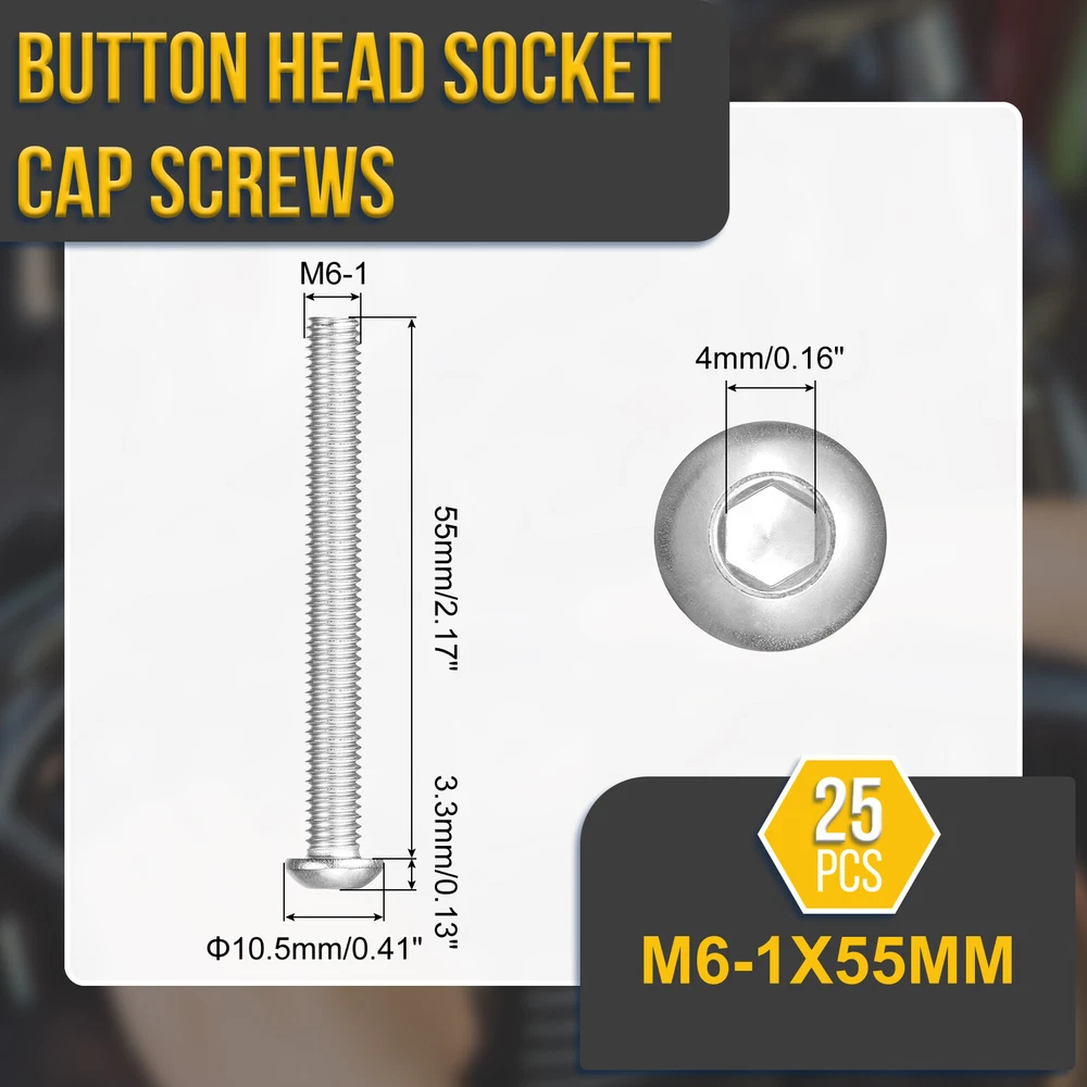 Document Product Details:Color: SilverMaterial: 304 Stainless SteelFinish: WhitewashedThread Type: Coarse ThreadThread Dia.: M6Thread Pitch: 1mm/0.04"Thread Length: 55mm/2.17"Head Dia.: 10.5mm/0.41"Head Thickness: 3.3mm/0.13"Hexagon Width: 4mm/0.16"Package Content: 25pcs x Button Head Hex Socket ScrewsMaterial - Constructed with stainless steel material with whitewashed treatment, the hex socket cap screw is of stronger durability, has a bright appearance, is not easier to deform or corrode, and has a long service life than other surface finishes.Feature - The button socket head cap screw is designed with an inner hex drive style and pan head, providing a higher torque and clamping force, as well as offering a wider bearing surface and high tensile strength. Application - Good replacement parts and construction fasteners for cars, bicycles, communication equipment, and ship assembly.Installation - To access this hex drive screw, you will need to use a hex wrench to tighten or loosen it. The socket button head design enhances torque capabilities, allowing for greater clamping force. For optimal results, it is recommended to use a retaining washer to lock the hex drive in place securely. M6-1x55mm Button Head Socket Cap Screws 25Pack 304 Stainless Steel Silver Product Details: Color: Silver Material: 304 Stainless Steel Finish: Whitewashed Thread Type: Coarse Thread Thread Dia.: M6 Thread Pitch: 1mm/0.04" Thread Length: 55mm/2.17" Head Dia.: 10.5mm/0.41" Head Thickness: 3.3mm/0.13" Hexagon Width: 4mm/0.16" Package Content: 25pcs x Button Head Hex Socket Screws Material - Constructed with stainless steel material with whitewashed treatment, the hex socket cap screw is of stronger durability, has a bright appearance, is not easier to deform or corrode, and has a long service life than other surface finishes. Feature - The button socket head cap screw is designed with an inner hex drive style and pan head, providing a higher torque and clamping force, as well as offering a wider bearing surface and high tensile strength. Application - Good replacement parts and construction fasteners for cars, bicycles, communication equipment, and ship assembly. Installation - To access this hex drive screw, you will need to use a hex wrench to tighten or loosen it. The socket button head design enhances torque capabilities, allowing for greater clamping force. For optimal results, it is recommended to use a retaining washer to lock the hex drive in place securely. Hot Item Payment 1.We accept eBay payment . 2.Payment must be received within 7 business days of auction closing. Shipping 1.We ship to your eBay or Paypal address. Please make sure your eBay and Paypal address is correct before you pay. 2.Items will be shipped within 1-3 business day when we received payment. 3.Delivery time depends on destination and other factors. Description Policy M6-1x55mm Button Head Socket Cap Screws 25Pack 304 Stainless Steel Silver Product Details: Color: Silver Material: 304 Stainless Steel Finish: Whitewashed Thread Type: Coarse Thread Thread Dia.: M6 Thread Pitch: 1mm/0.04" Thread Length: 55mm/2.17" Head Dia.: 10.5mm/0.41" Head Thickness: 3.3mm/0.13" Hexagon Width: 4mm/0.16" Package Content: 25pcs x Button Head Hex Socket Screws Material - Constructed with stainless steel material with whitewashed treatment, the hex socket cap screw is of stronger durability, has a bright appearance, is not easier to deform or corrode, and has a long service life than other surface finishes. Feature - The button socket head cap screw is designed with an inner hex drive style and pan head, providing a higher torque and clamping force, as well as offering a wider bearing surface and high tensile strength. Application - Good replacement parts and construction fasteners for cars, bicycles, communication equipment, and ship assembly. Installation - To access this hex drive screw, you will need to use a hex wrench to tighten or loosen it. The socket button head design enhances torque capabilities, allowing for greater clamping force. For optimal results, it is recommended to use a retaining washer to lock the hex drive in place securely. Hot Item Payment 1.We accept eBay payment . 2.Payment must be received within 7 business days of auction closing. Shipping 1.We ship to your eBay or Paypal address. Please make sure your eBay and Paypal address is correct before you pay. 2.Items will be shipped within 1-3 business day when we received payment. 3.Delivery time depends on destination and other factors.