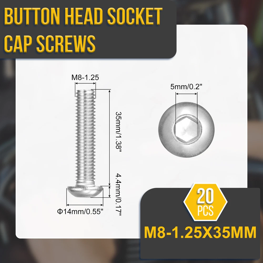 Document Product Details:Color: SilverMaterial: 304 Stainless SteelFinish: WhitewashedThread Type: Coarse ThreadThread Dia.: M8Thread Pitch: 1.25mm/0.05"Thread Length: 35mm/1.38"Head Dia.: 14mm/0.55"Head Thickness: 4.4mm/0.17"Hexagon Width: 5mm/0.2"Package Content: 20pcs x Button Head Hex Socket ScrewsMaterial - Constructed with stainless steel material with whitewashed treatment, the hex socket cap screw is of stronger durability, has a bright appearance, is not easier to deform or corrode, and has a long service life than other surface finishes.Feature - The button socket head cap screw is designed with an inner hex drive style and pan head, providing a higher torque and clamping force, as well as offering a wider bearing surface and high tensile strength. Application - Good replacement parts and construction fasteners for cars, bicycles, communication equipment, and ship assembly.Installation - To access this hex drive screw, you will need to use a hex wrench to tighten or loosen it. The socket button head design enhances torque capabilities, allowing for greater clamping force. For optimal results, it is recommended to use a retaining washer to lock the hex drive in place securely. M8-1.25x35mm Button Head Socket Cap Screws 20Pack 304 Stainless Steel Silver Product Details: Color: Silver Material: 304 Stainless Steel Finish: Whitewashed Thread Type: Coarse Thread Thread Dia.: M8 Thread Pitch: 1.25mm/0.05" Thread Length: 35mm/1.38" Head Dia.: 14mm/0.55" Head Thickness: 4.4mm/0.17" Hexagon Width: 5mm/0.2" Package Content: 20pcs x Button Head Hex Socket Screws Material - Constructed with stainless steel material with whitewashed treatment, the hex socket cap screw is of stronger durability, has a bright appearance, is not easier to deform or corrode, and has a long service life than other surface finishes. Feature - The button socket head cap screw is designed with an inner hex drive style and pan head, providing a higher torque and clamping force, as well as offering a wider bearing surface and high tensile strength. Application - Good replacement parts and construction fasteners for cars, bicycles, communication equipment, and ship assembly. Installation - To access this hex drive screw, you will need to use a hex wrench to tighten or loosen it. The socket button head design enhances torque capabilities, allowing for greater clamping force. For optimal results, it is recommended to use a retaining washer to lock the hex drive in place securely. Hot Item Payment 1.We accept eBay payment . 2.Payment must be received within 7 business days of auction closing. Shipping 1.We ship to your eBay or Paypal address. Please make sure your eBay and Paypal address is correct before you pay. 2.Items will be shipped within 1-3 business day when we received payment. 3.Delivery time depends on destination and other factors. Description Policy M8-1.25x35mm Button Head Socket Cap Screws 20Pack 304 Stainless Steel Silver Product Details: Color: Silver Material: 304 Stainless Steel Finish: Whitewashed Thread Type: Coarse Thread Thread Dia.: M8 Thread Pitch: 1.25mm/0.05" Thread Length: 35mm/1.38" Head Dia.: 14mm/0.55" Head Thickness: 4.4mm/0.17" Hexagon Width: 5mm/0.2" Package Content: 20pcs x Button Head Hex Socket Screws Material - Constructed with stainless steel material with whitewashed treatment, the hex socket cap screw is of stronger durability, has a bright appearance, is not easier to deform or corrode, and has a long service life than other surface finishes. Feature - The button socket head cap screw is designed with an inner hex drive style and pan head, providing a higher torque and clamping force, as well as offering a wider bearing surface and high tensile strength. Application - Good replacement parts and construction fasteners for cars, bicycles, communication equipment, and ship assembly. Installation - To access this hex drive screw, you will need to use a hex wrench to tighten or loosen it. The socket button head design enhances torque capabilities, allowing for greater clamping force. For optimal results, it is recommended to use a retaining washer to lock the hex drive in place securely. Hot Item Payment 1.We accept eBay payment . 2.Payment must be received within 7 business days of auction closing. Shipping 1.We ship to your eBay or Paypal address. Please make sure your eBay and Paypal address is correct before you pay. 2.Items will be shipped within 1-3 business day when we received payment. 3.Delivery time depends on destination and other factors.