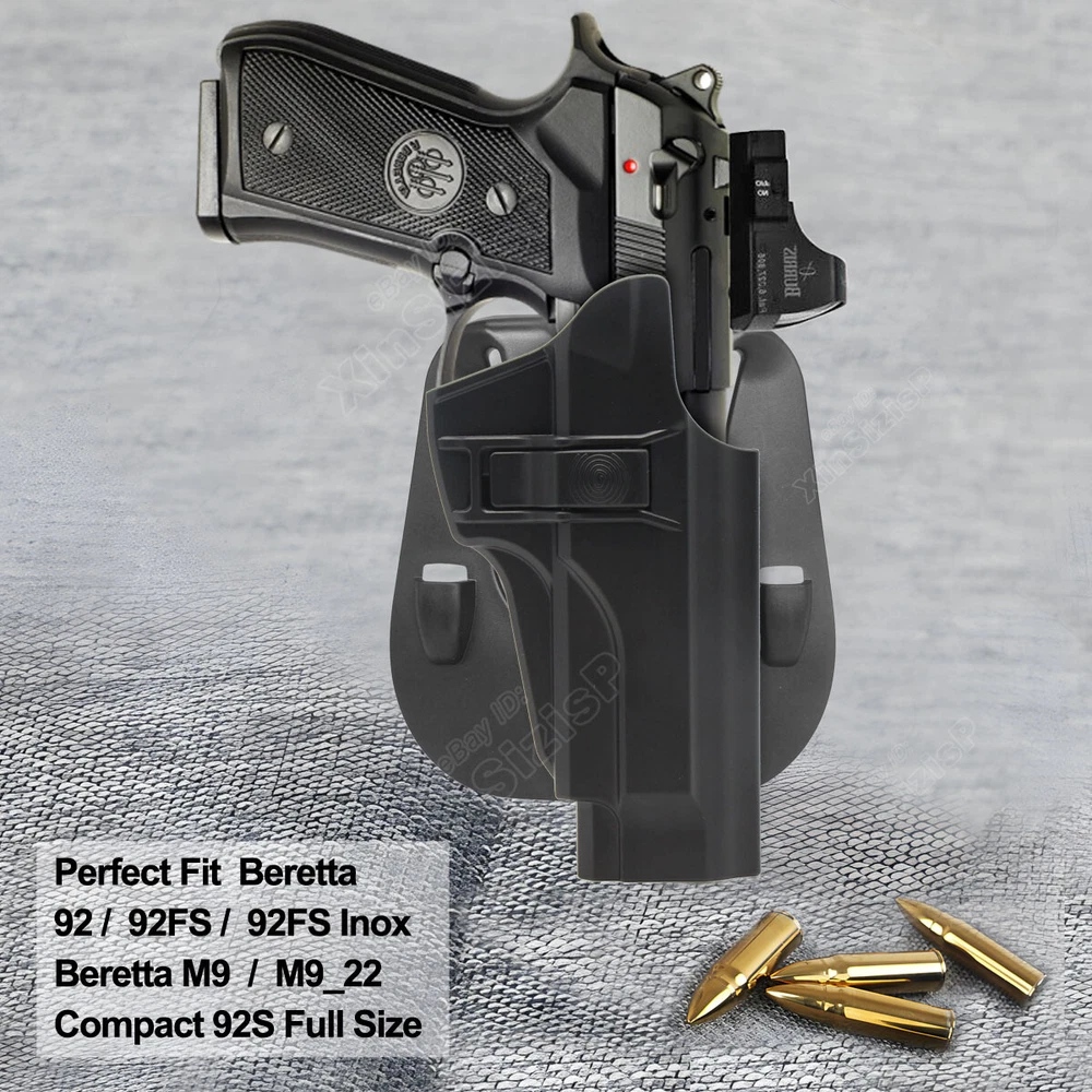High Quality Military & Police Grade Polymer OWB Holster Specially Designed For Fast Draw During Duty Or Shooting Competition. Item Description: Tactical Outside Waistband Holster for. Holster fit Beretta Beretta 92 9mm Luger Beretta 92FS 4.9” 9mm Luger Beretta 92FS Inox 4.9” 9mm Luger Beretta M9 4.9” 9mm Luger Beretta M9_22 .22 LR Beretta Compact 92S Full Size 9mm Luger Beretta Compact 92S Centurion 9mm Luger Beretta 92G ELITE LTT 9mm Luger Holster fit Taurus PT92 9mm Luger Does not fit: Taurus PT92 AF-D / AF-S (due to the rail being blocked). Beretta 92FS Brigadier / Brigadier Inox / Compact / Compact Inox, 92A1, 96A1, M9A1, M9A3, M9A4, M9A1_22. (It perfect fit the gun with Optic Mount Mini Sight above on the end of the barrel, But without laser and no embedded chassis, and no flashlight style ) Materials & Durable Made of durable high-tech polymer materials - Stronger than leather will wear out, the polymer holster will not wear out and get flimsy.Adapt to every environment High S afety I ndex-finger release for quick release button (Level II retention) An audible click lock system ensures knowing when your weapon is securely holstered A djustable E asily set your paddle /belt cant 0-60 degrees according to your preference with the Allen key Ease And Comfort Easy on / Easy off- No need to undo your belt every time you wear your holster.Sweat-proof- Protect your weapon from salty perspiration and not absorb sweat. In the Package: · 1*Holster with Paddle Attachment · 1*Allen Key Shipping: Ships same day or next except Sundays and Holidays ! Free shipping! Ship by USPS First Class Package. 100% MONEY BACK GUARANTEE. Any question please be free to contact with us .Thanks!