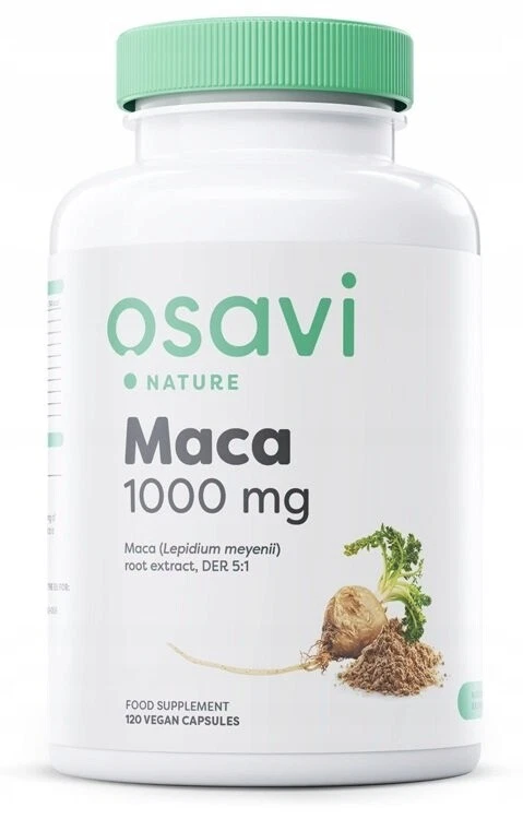 Diet supplement MACA Extract - 1000 mg 120 vegan capsules Dietary supplement in the form of a hard capsule containing an extract of Peruvian peppercorn root (maca), which grows wild in the Andes hills. Maca root helps maintain sexual activity and libido. Maca root supports sexual function in women and men. Maca root helps maintain optimal vitality and physical and mental well-being. What makes capsules stand out? Maca 1000 mg? Ripe extract maca root . Maca growing wild in Peru , where it is an endemic species growing in the Andes. Extract with a strength equivalent to 5000 mg of maca root. GMO-free, gluten-free, lactose-free, soy-free. Suitable for vegetarians and vegans. Packaging made of BioPET (30% of the material comes from sugar cane). INGREDIENTS: Peruvian pepper root extract (Lepidium meyenii), shell (hydroxypropyl methylcellulose), inulin. RECOMMENDED DAILY INGESTION AND HOW TO USE: Swallow the capsule with some water. We suggest taking 2 capsules after a meal. CONTENTS IN THE DAILY SERVING - 1 CAPSULE / 2 CAPSULES: Peruvian peppercorn root extract (Lepidium meyenii), DER 5:1 - 500 mg / 1000 mg WARNINGS AND STORAGE: Do not exceed the recommended daily dose. Do not use in children, pregnant or lactating women. A dietary supplement cannot be used as a substitute for a varied diet. To maintain proper health, you should eat a varied diet and lead a healthy lifestyle. Store in a dark and dry place at room temperature, out of the reach of small children. PRODUCER: Osavi