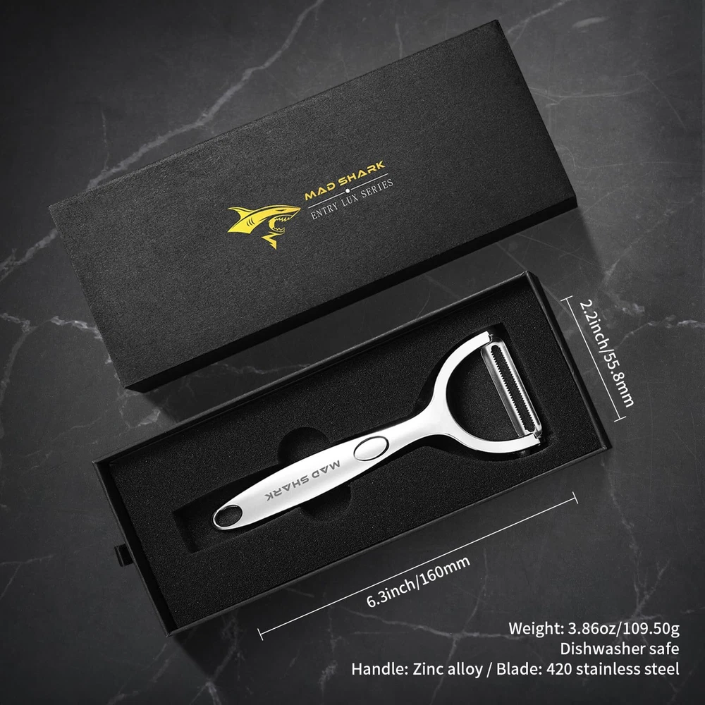 MAD SHARK Ultra Sharp vegetable peelers for kitchen – 10 Years No-Rust Stainless Features: EXTRA SHARP POTATOES PEELER: This best Kitchen peeler is crafted with serrated Swivelling blades that effortlessly contour to the curves of fruits and vegetables, peeling ultra-thin layers to reduce food waste. Say goodbye to stuck peels and hello to fast, hassle-free meal prep with the Y-shaped Peeler designed for effortless, precise peeling every time ERGONOMIC COMFORT GRIP PEELER: Designed with a longer, anti-slip handle, this peeler ensures a secure, comfortable grip for all hand sizes, perfect for both left and right-handed users. This safe peeler Ideal for peeling fruits, vegetables, hard cheeses, and more, it reduces strain on your hands, making it especially beneficial for those with arthritis or weakened grip strength NO-CLOG PEELER: Crafted with smooth glide technology, this easy to use peeler ensures smooth, effortless peeling without clogging. Its ultra-sharp blade preserves the nutrients of fruits and vegetables, making it perfect for peeling potatoes, carrots, cucumbers, apples, tomatoes, and more TOP GRADE HIGH-QUALITY MATERIAL: This rust-free potato peeler features a premium 304 stainless-steel blade that stays ultra-sharp, ensuring effortless peeling every time. Built to last, this durable peeler can withstand extensive use without dulling, breaking, or discoloring, providing reliable performance for all your kitchen peeling needs EASY TO CLEAN: Featuring an upgraded rust-free carbon steel blade and a zinc alloy body with a streamlined design, this easy to clean peeler is dishwasher safe and easy cleanup, ensuring effortless maintenance and long-lasting performance Features: EXTRA SHARP POTATOES PEELER: This best Kitchen peeler is crafted with serrated Swivelling blades that effortlessly contour to the curves of fruits and vegetables, peeling ultra-thin layers to reduce food waste. Say goodbye to stuck peels and hello to fast, hassle-free meal prep with the Y-shaped Peeler designed for effortless, precise peeling every time ERGONOMIC COMFORT GRIP PEELER: Designed with a longer, anti-slip handle, this peeler ensures a secure, comfortable grip for all hand sizes, perfect for both left and right-handed users. This safe peeler Ideal for peeling fruits, vegetables, hard cheeses, and more, it reduces strain on your hands, making it especially beneficial for those with arthritis or weakened grip strength NO-CLOG PEELER: Crafted with smooth glide technology, this easy to use peeler ensures smooth, effortless peeling without clogging. Its ultra-sharp blade preserves the nutrients of fruits and vegetables, making it perfect for peeling potatoes, carrots, cucumbers, apples, tomatoes, and more TOP GRADE HIGH-QUALITY MATERIAL: This rust-free potato peeler features a premium 304 stainless-steel blade that stays ultra-sharp, ensuring effortless peeling every time. Built to last, this durable peeler can withstand extensive use without dulling, breaking, or discoloring, providing reliable performance for all your kitchen peeling needs EASY TO CLEAN: Featuring an upgraded rust-free carbon steel blade and a zinc alloy body with a streamlined design, this easy to clean peeler is dishwasher safe and easy cleanup, ensuring effortless maintenance and long-lasting performance eBay integration by