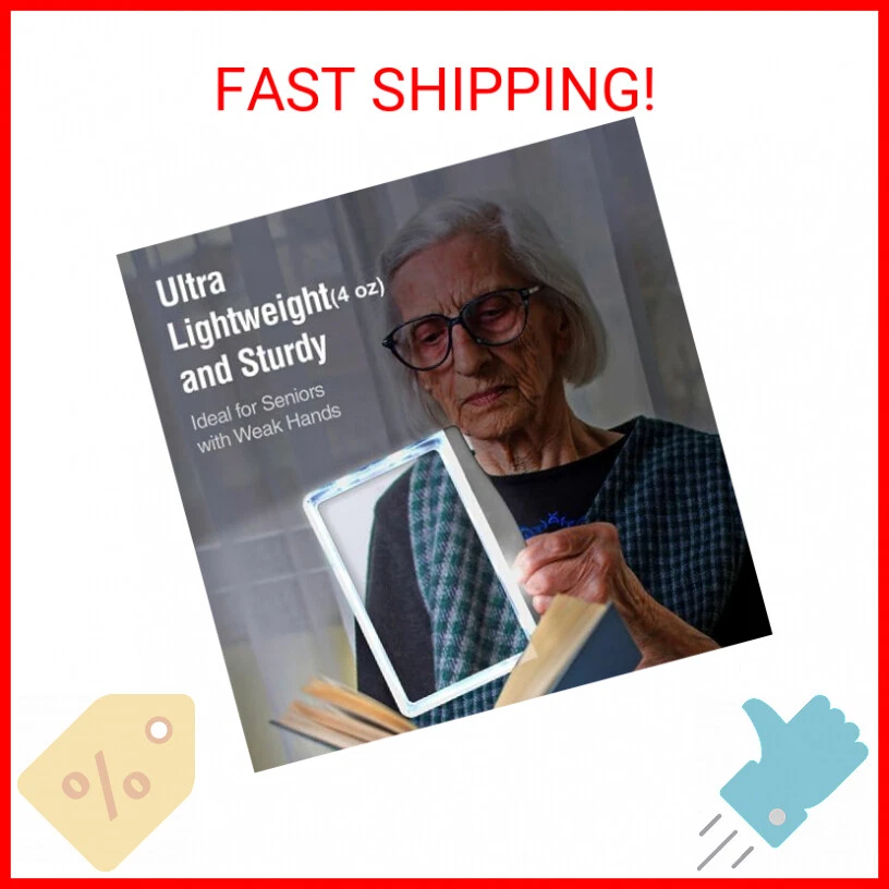 MAGNIPROS 5X Large LED Page Magnifier for Reading with 3 Color Lighting Modes & Anti-Glare Lens to Reduce Eye Strain-Perfect for Small Prints, Aging Eyes, Low Vision and Seniors - Acrylic Lens - EYE COMFORT ANTI-GLARE LENS: Designed for seniors & low vision individuals, With the unique anti-glare lens, our magnifier minimizes the harshness of bright lights, providing relief to your eyes. This ensures longer, more comfortable reading or viewing sessions without the need for frequent breaks. - LARGE & CRYSTAL CLEAR VIEWING AREA: Experience a wide viewing with our 4.5"x 7" optical-grade Acrylic lens, which magnifies up to 500% for hassle-free reading without constant hand movement. - 3 COLOR LIGHT MODES: Featuring the latest ONE-button/touch and lighting technology on a magnifying glass for reading, turn on/off, switch effortlessly among cool white, warm white, and combo lighting modes to match your reading conditions. This latest technology in magnifying glass illumination ensures optimal comfort and clarity for all your reading needs. - LIGHTWEIGHT & ERGONOMIC DESIGN: Weighing just 4 ounces the lightest for it's size, our magnifier is lightweight for extended use. Its ergonomic grip design suits most hands, ensuring prolonged reading without arm fatigue. - REDUCE EYE STRAIN, IDEAL FOR LOW VISION & SENIORS: This page magnifier not only provides adequate magnification but also enough lighting with 24 SMD led lights which are covered by anti-glare reflector, so lighting will be directed to the designated area without glare to your eyes and provide evenly lit viewing area. - LONG-LASTING & ENERGY EFFICIENT LEDs : Featuring 24 high-performance SMD LEDs, these lights are powered by 3 AAA batteries(NOT included) and designed to be brighter while using 50% less energy compared to conventional LEDs. This efficiency means batteries will last two times longer. Plus, these LEDs boast an impressive lifespan of over - IDEAL GIFT FOR SENIORS & LOW VISION: This magnifier is a beacon of clarity, tailor-made for seniors and those with vision challenges. Its LED lighting and ergonomic design provide enhanced reading ease, reigniting the joy of books and fine details. A perfect blend of functionality and thoughtfulness, it offers a gesture of care and understanding. An invaluable gift for birthdays or special moments, ensuring daily empowerment and comfort. Payments We accept the following payment methods PayPal Support Our dedicated customer support team is here to assist you from 9AM to 5PM Monday through Friday, excluding public holidays. Should you reach out to us and not recieve an immediate response, it's likely due to a higher-than-usual volume of inquires. We want to reassure you that your concerns are important to us, and we're working dilligently to get back to you. Expect a response by the next business day at the latest. Your understanding and patience are greatly valued as we strive to provide you with the best support possible! Shipping All orders are processed within 5 business days. Shipping estimates may be shown on this listing by eBay, and these are often not an accurate reflection of our shipping times. If we are experiencing a high volume of orders, shipments may be delayed by a few days. Please allow additional days in transit for delivery. If there will be a significant delay in shipment of your order, we will contact you via message. Shipping rates & delivery estimates Shipping is often free, but if charges for your order apply they will be calculated and displayed at checkout.