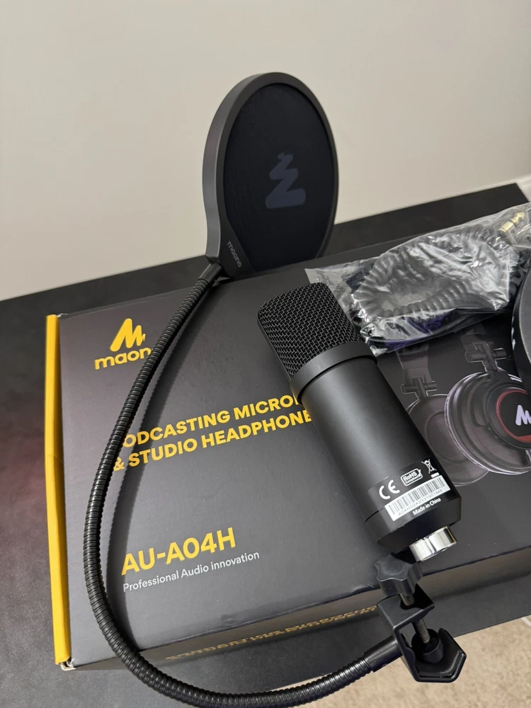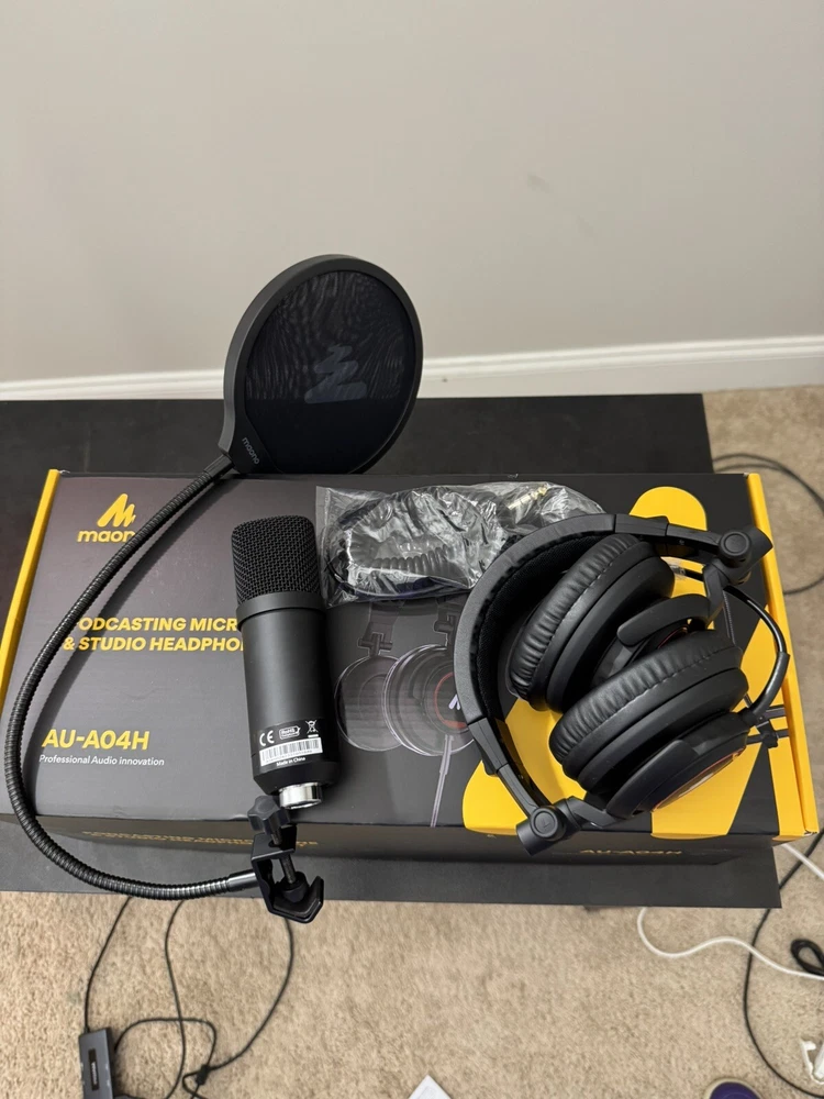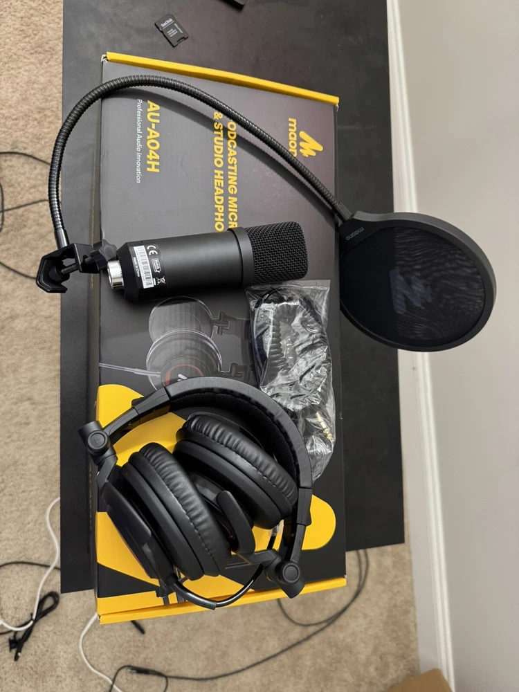Brand new , never used open boxed!! This bundle includes the MAONO AU-A04 USB Microphone and the AU-MH601 Studio Monitor Headphones. The microphone is a condenser microphone with a cardioid polar pattern and is suitable for music and home recording. It has plug and play functionality and connects using USB or USB-C. The diaphragm size is A04. The headphones are designed for professional monitoring and have a brand name of MAONO.