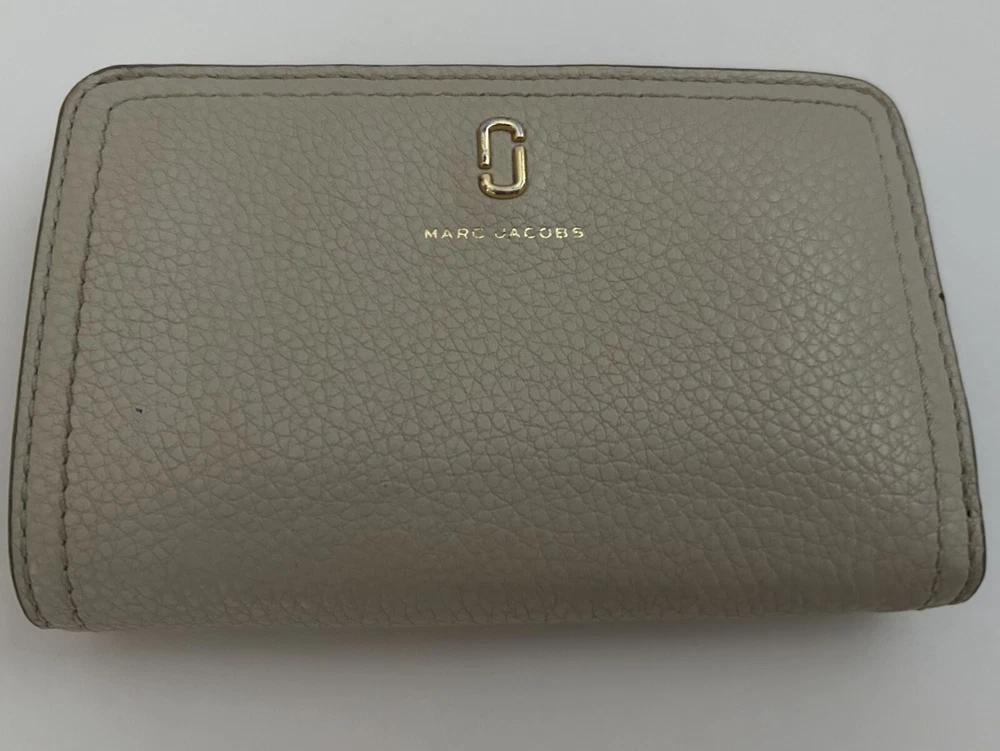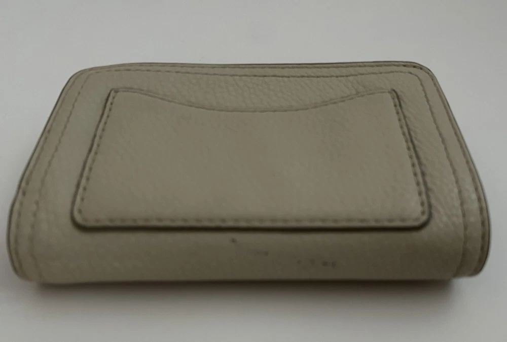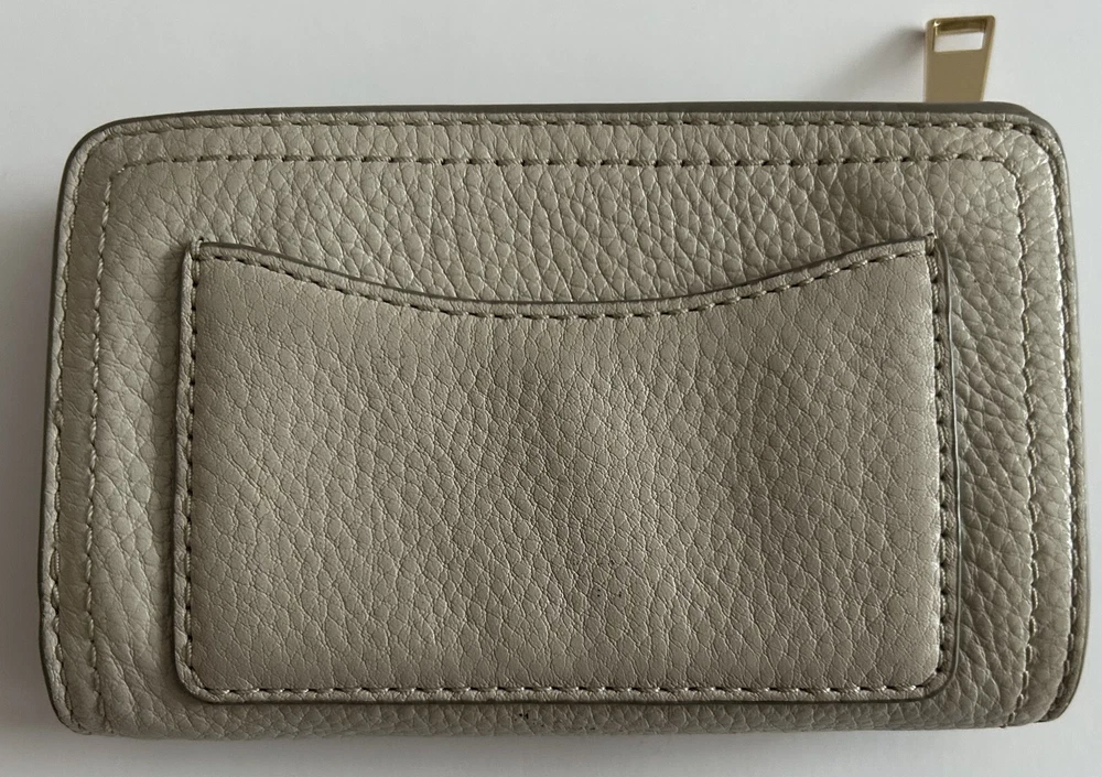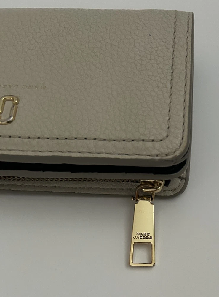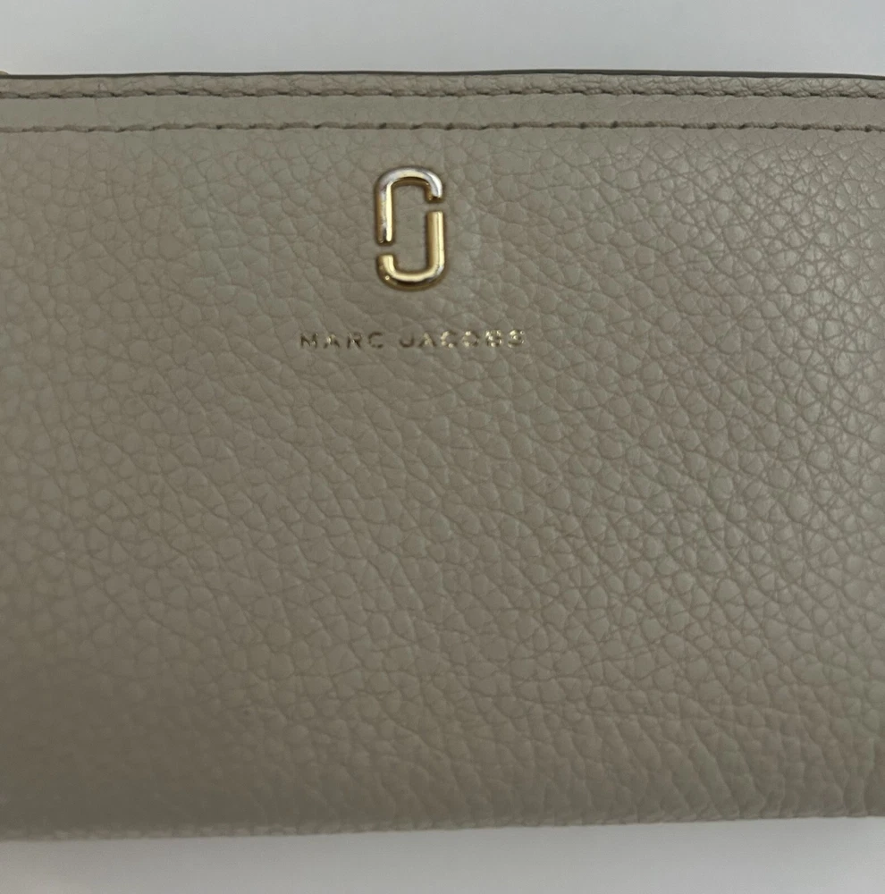 This is a MARC JACOBS bifold leather zipper wallet designed for women. It comes in a cream color and is made of leather. The wallet measures 5 5/8 inches long and is suitable for holding credit cards, cash and coins among other items. Dimensions: 5 5/8" long x 3 1/2" high x 1 1/4" thick (with no items).