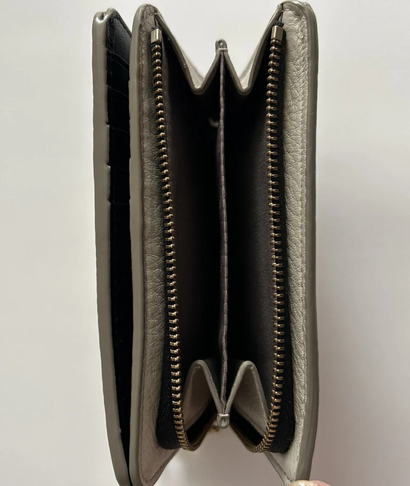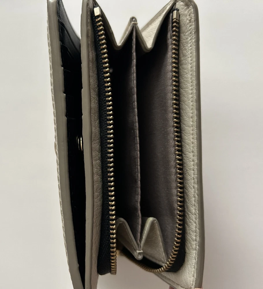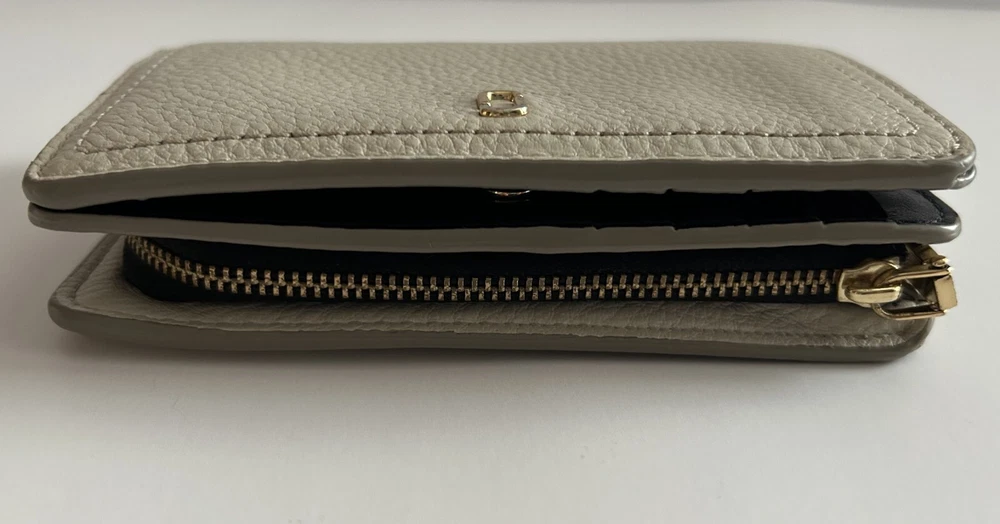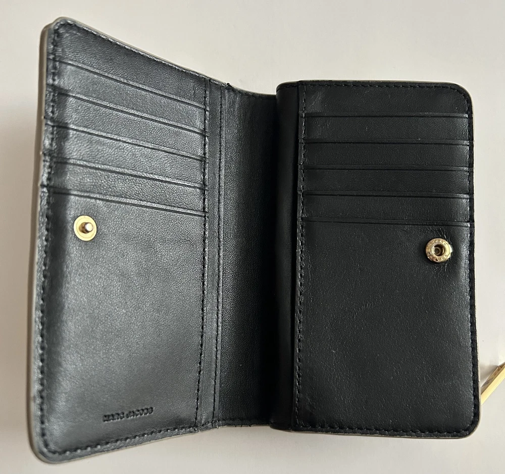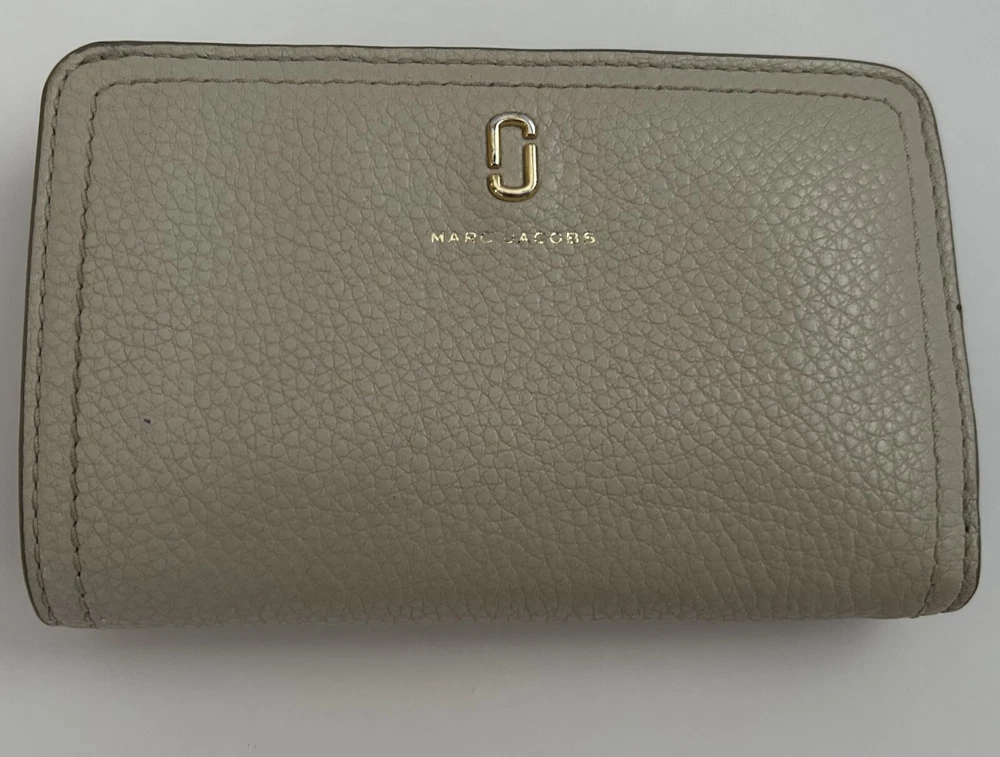 This is a MARC JACOBS bifold leather zipper wallet designed for women. It comes in a cream color and is made of leather. The wallet measures 5 5/8 inches long and is suitable for holding credit cards, cash and coins among other items. Dimensions: 5 5/8" long x 3 1/2" high x 1 1/4" thick (with no items).