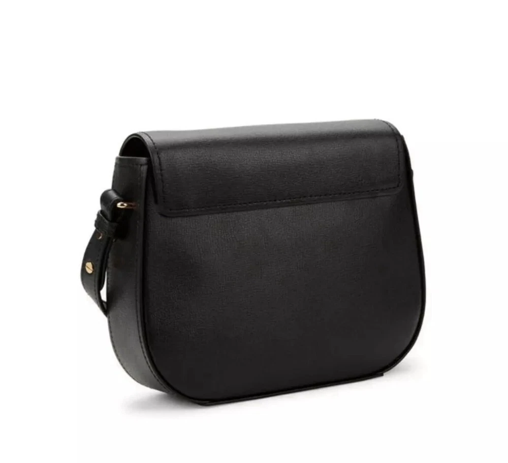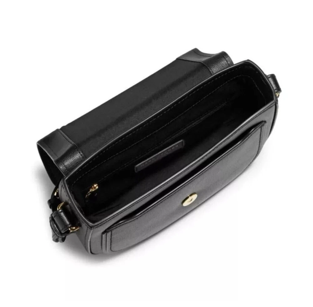 Fold over magnetic snap closure Leather Gold-tone hardware One inside zip pocket Two inside slip pockets Lined Leather/polyurethane coating Crossbody strap, 19"-27" drop 9.5"W x 8"H x 2.25"D