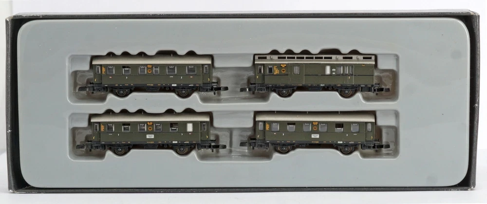 MARKLIN MINI-CLUB Gauge Z ( 1:220 ) " Höllentalbahn " DRG Passenger Car Set , Era II This amazing and hard to find set is NEW and box opened only to make these photos and check the content. Prototype: 4 German State Railroad Company (DRG) standard design branch line cars. 1 type Bci-34 car, 2nd and 3rd class. 2 type Ci-33 cars, 3rd class.1 type PwPosti-34 mail/baggage car. Description: Total length over the buffers 245 mm / 9-5/8". Features: Märklin exclusive special model - produced in a one-time series. MARKLIN MINI-CLUB item: 87672 Box in excellent condition What you see is what you get! Gruppo di carrozze passeggeri "Ferrovia della Höllental" , MARKLIN MINI-CLUB in scala Z ( 1:220 ) , Epoca II Questo splendido e raro set è NUOVO e la confezione è stata aperta solo per controllare il contenuto e fare queste fotografie. Prototipo: 4 carrozze unificate per ferrovie vicinali della Compagnia della Ferrovia Tedesca del Reich (DRG). 1 carrozza Bci-34, 2° e 3° classe. 2 carrozze Ci-33, 3° classe. 1 carrozza postale-bagagliaio PwPosti-34. Descrizione: Lunghezza complessiva ai respingenti 245 mm. Caratteristica: Modello esclusivo Märklin , prodotto in una sola serie. Codice MARKLIN MINI-CLUB: 87672 La scatola è in ottimo stato. Quello che vedete è quello che riceverete! NOTE: IMPORTANT for WORLDWIDE eBayer: I ship this item from ITALY and I ship worldwide. If you need to buy others models, please contact me to know the correct shipping cost, thank you. You are Welcome! IMPORTANTE per eBAYER ITALIANI (Italian eBayer only): Spedisco questo oggetto dall'Italia con Raccomandata o Corriere Espresso in base alla quantità. Nel caso foste interessati all'acquisto di altri modelli , gentilmente contattatemi per conoscere le corrette spese di spedizione, grazie. Per qualsiasi ulteriore informazione e miglior prezzo sono a vostra disposizione.