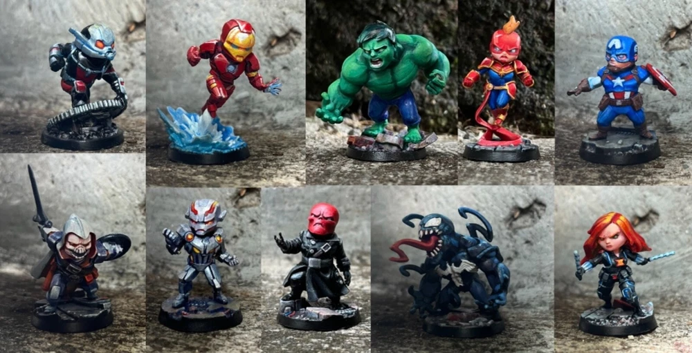 Painted Miniatures + Marvel United Game Core Set (w/Venom) LIKE NEW! Opened only to paint miniatures. Game has never been used! COLLECTOR’S TREASURE! RARE FIND! ONE OF A KIND! A FAN MUST-HAVE! (Painted by Professional Artist Wayne Lo) NO TIME TO PAINT? PAINTED, READY FOR OFFICIAL TOURNAMENT PLAY! Perfect gift for the Holidays! Get them started with Marvel United Avengers Painted Miniatures AND Complete Game Core Set. LIKE NEW — Opened only to paint miniatures. Complete core set. Cardboard Tokens unpunched. Unused Card sets, Unused Location cards, etc... Includes 7 Painted Hero miniatures of Black Widow, Hulk, Captain America, Iron Man, Ant-Man, Captain Marvel and Venom, plus 3 Painted Villain miniatures Task Master, Ultron, And Red Skull. Considered by many to be a fun, perfectly paced Super Hero Game! Hand painted by Hollywood Professional Artist, Wayne Lo (designer, art director, concept artist, costume design — Star Wars Clone Wars; Pirates of the Caribbean I, II, V; American Born Chinese, Eragon, Letters from Iwo Jima, Flag of Our Fathers, etc...) Wayne says, “Our family loves this game, and its expansion sets!! Had some great fun painting these minis. Applied decades of cross-over art experience and skills to the ins and outs painting minis!”