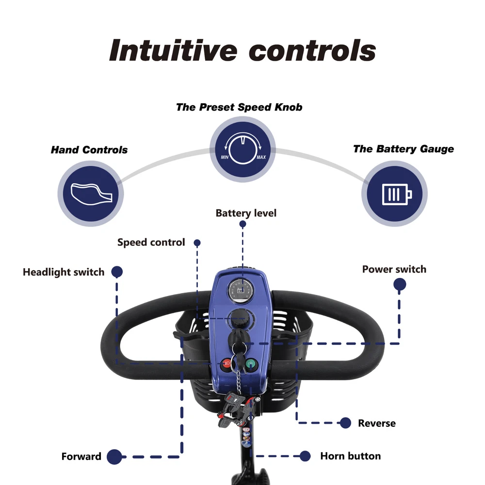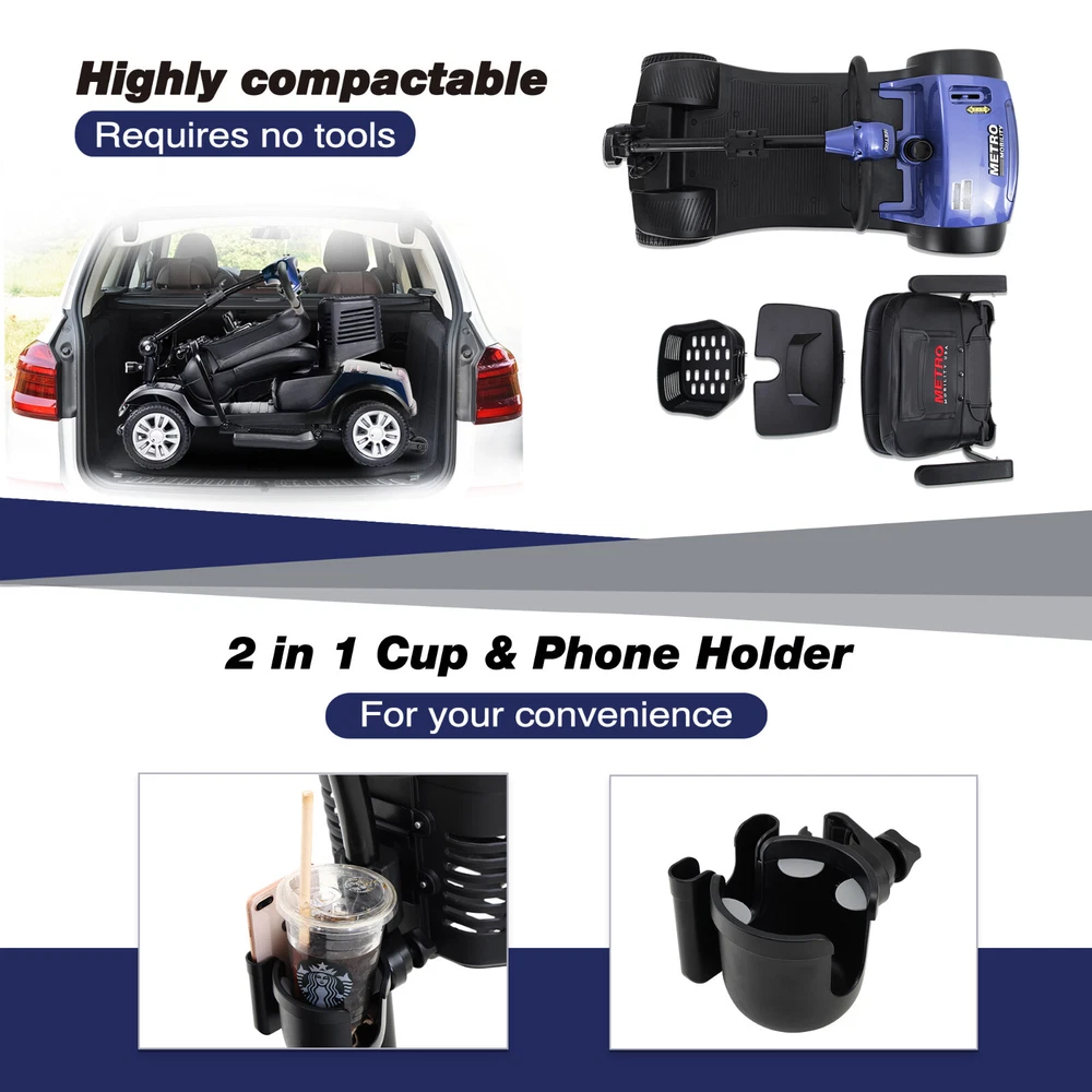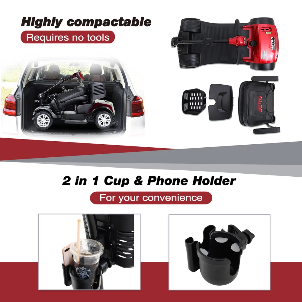 MAX SPORT 4 Wheels Foldable Compact Mobility Scooter with Cup & Phone Holder, US New Serie Scooter!!! MAX series mobility scooter delivers high-performance operation and easy disassembly for convenience on the go. It provides you extremely driving experience. Enjoy your perfect active lifestyle. Product Information Item Scooter Product Type General Item Product Name MAX SPORT 4 Wheels Outdoor Compact Mobility Scooter with 2 in 1 Cup & Phone Holder Main Color Red / Blue / Gray Main Material Metal Dangerous Goods Exempt Dangerous Goods: This product contains dangerous elements. However, the Dangerous Goods surcharge is not added to the shipping fee. Package Size Length (in.) 45.28 Width (in.) 21.26 Height (in.) 19.69 Weight (lbs) 105.82 Features: 1. Front & Rear LED Light 2. 300W Powerful Motor 3. 9 inches front & rear solid tyres 4. Rear Suspension 5. Max forwarding speed: 4.97mph 6. Weight capacity: 136kg(300lbs ) 7. Max driving gradient: 8° 8. Driving Range: 10 miles 9. High-performance operation and easy disassembly 10. Sliding swivel seat with flip-up armrests 11. Intelligent electromagnetic brake 12. Simple control panel can operate with fingertips or thumbs effortlessly 13. Red and Blue/Gray color options. Specifications: Max Forward Speed:4.97 mph Max Driving Gradient: 8° Max Driving Range: 10 miles Weight Capacity: 300lbs Suspensions: Rear Tire Sizes: 9"x3"(front) 9"x3"(rear) Driving System: Rear wheel Brake System: Electromagnetic Brake Batteries: Lead-acid 12V12AH*2pcs Charger: DC24V2A AC100-240V Charging Time: 6-8H Motor: 300W Motor Controller: 24V/50A(Dynamic)