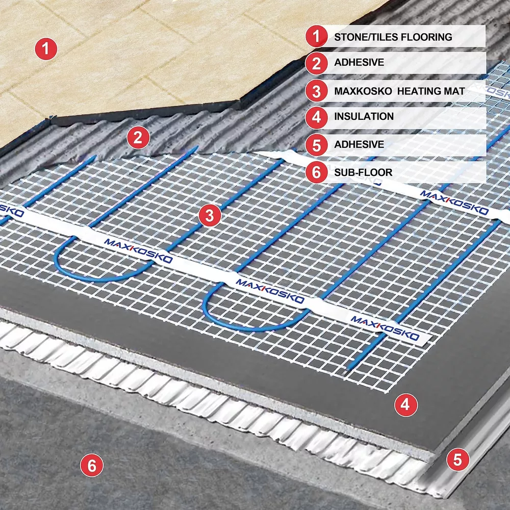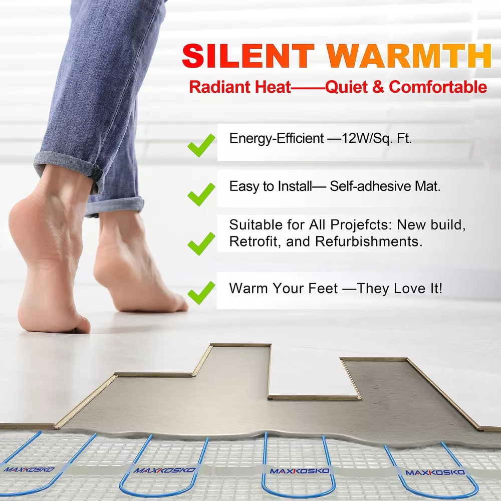 MAXKOSKO 80sq.ft. Electric Floor Heat Mat Kit, 120V Underfloor Radiant Heating System for Tile,Stone and Laminate Indoor Use with Alarm Cable Monitor Step on Warmth with Floor Heating Mat: Heated flooring system for tile provide maximized warmth to keep the floor warm no matter how cold it gets and it comes in various sizes to suit your needs covering 10 to 100 sq.ft.! Who wouldn't enjoy the comfort of a radiant in-floor heating system in their home when the weather gets cooler? Easy to Install: The heated floor mats for indoor use can be easily installed under tile, stone, wood, or laminate flooring .Simply use Warm Heating Mat to unroll and secure your Electric Under Floor Heating Mat to the subfloor, apply a thin layer of mortar, and install the floor.Easily cut the in floor heating mat to fit any odd corners and smaller spaces. Technology Information:80 Sqft (20"wide x 9.1ft long). Voltage: 120, Amps: 1.5, Watts: 180 @ 12w/sqft. One piece 80 sq.ft. floor heater consists of a heating cable secured with heating tape onto a fiber-glass mesh. The flexible design of our heating wires allows it to be easily installed in a variety of different flooring types, such as tile, stone and hardwood. Indoor Use: The Fully Self-adhesive Floor Heat Heating System is ideal for room renovations, bathroom remodeling. Can be used for humid application, but not for installation in pool and spa areas, nor outdoor use. It works in almost any rectangular space. A must-have product for tile floors! Safe and Value for Money: The radiant floor heating kits has high safety and is not easy to be damaged. Under Tile Heating Mat can be used for more than 20 years based on correct installation methods and completion of all test requirements. Shipping We offer FREE shipping on all orders! We ship within Three business days of payment, usually sooner. We use a selection of shipping services such as UPS, FedEx, USPS etc. We only ship to the lower 48 states, no APO/FPO addresses or PO Boxes allowed. Local pickups and combined shipping options are not provided at this time. Return You can return a product for up to 30 days from the date you purchased it. Any product you return must be in the same condition you received it and in the original packaging. Please keep the receipt. Payment We accept payment by any of the following methods: PayPal Please pay as soon as possible after winning an auction, as that will allow us to post your item to you sooner! Feedback Customer satisfaction is very important to us. If you have any problem with your order, please contact us and we will do our best to make you satisfied. Contact Us If you have any queries, please contact us via ebay. We usually respond within 24 hours on weekdays. Please visit our eBay store to check out other items for sale! Thank you for shopping at our store.