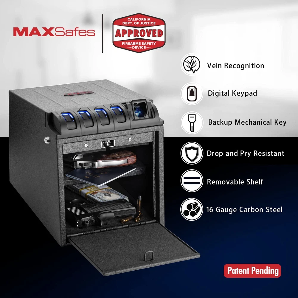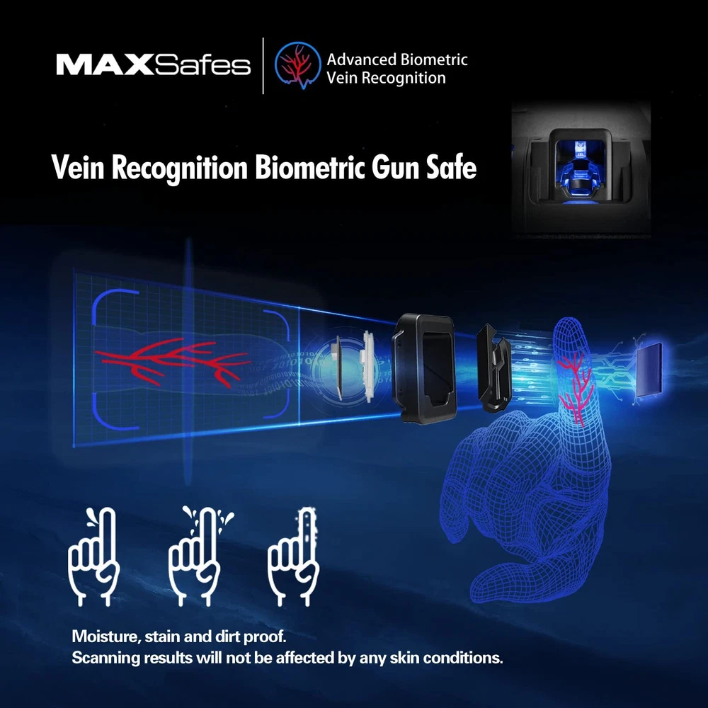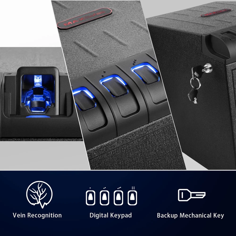 MAXSafes Two Gun Vault Super Biometric Finger Vein Recognition Lock QuickAccess MAXSafe Pro Two Gun Vault Dimensions: 16" x 13.3" x 11". Vein-recognition technology. Backlit keypad entry. Backup key entry. Removable shelf. Exceeds the CADOJ standard for drop and pry resistance test. Fits two full-size pistols with extra space for attachments and accessories. Carbon steel construction. Features Advanced Finger Vein RecognitionOur biometric gun safe features an advanced finger vein recognition scanner for reliable and accurate protection. Unlike fingerprint scanners, finger vein recognition is virtually impossible to fabricate or copy. It also works well with sweaty, wet, oily, or damaged fingers, making it a more dependable and secure option Heavy-Duty and Secure ConstructionOur handgun safe is constructed with a heavy 16-gauge carbon steel housing and a robust 16-gauge pry-resistant door for maximum strength and security. It also incorporates a reliable high-strength locking mechanism and precise fittings that are nearly impossible to pry open with hand tools. Additionally, our safe is California DOJ certified for added peace of mind Quick Access with Multiple OptionsOur safe provides quick access to your valuables and documents through an auto-open door and three opening methods, including a 4-6 digit combination code, mechanical backup key, and advanced finger vein recognition. Our vein recognition biometric can also store up to 50 sets of finger vein IDs for multiple users Convenient FeaturesOur safe is designed with user convenience in mind. It features a silent mode, alarm mode, interior LED light, and removable shelf for easy organization and access to your items One Year WarrantyWe offer an unconditional one-year warranty 12 months warranty and lifetime technical support on our biometric gun safe. Our commitment to quality and customer satisfaction ensures that you can purchase with confidence Details Product Dimensions: 15.75 x 11.25 x 13.0 inches Item Weight: 20.0 pounds Shipping Weight: 20.0 pounds Manufacturer: MAXSafes Item color: Black Item MPN: 10003V Fast and Free Shipping You're already purchasing the item. Why pay additional for shipping, especially slow shipping? We get your order shipped out within 1-business day and delivered to your doorstep as quickly as possible. Competitive Pricing With our dynamic pricing model, our prices are always competitive. Our prices are some of the lowest that you will find on the internet. Rest assured that you're getting a good deal when purchasing with us. 30-day Money Back Guarantee We are committed to making sure that you leave this transaction satisfied. If you're unhappy with the product for any reason, you may return it back for your money-back or a replacement within 30 days. No questions asked!