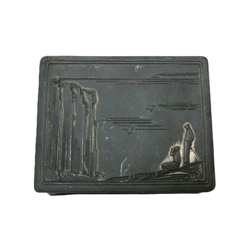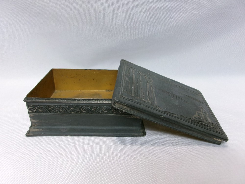 DETAILS · The outside looks like lead; The inside is gold-tone metal. Good vintage condition. The lid was once hinged to the box, but the hinge is broken off and now the lid simply lifts off (but fits nicely on the lip); Priced accordingly. There is very slight wear commensurate with age. I found no other notable flaws. Approx. 4” x 3 ¼” x 1 ¾” tall. - VISIT MY EBAY STORE! - I am selling many other vintage items and offer combined shipping; Message me for a quote. _____________________________ If there is any issue you are not happy with, please message me directly. I aim for 100% satisfaction! _________________________________________
