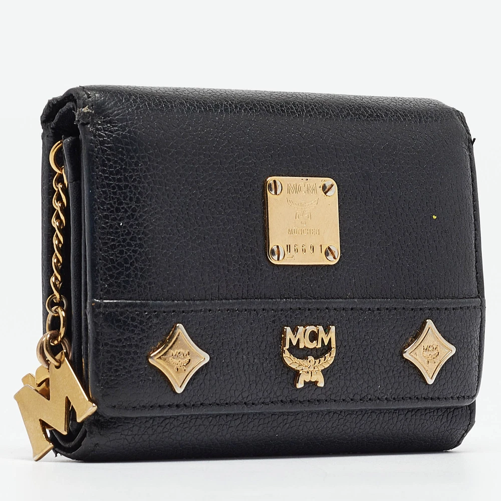 This small but functional wallet from MCM has been expertly designed in a trifold silhouette that can neatly organize all your essentials. It features card slots, a zipper pouch to hold coins, and slots to keep your currency. It can easily be carried wherever you goCertified by The Luxury Closet - This item has gone through a detailed authentication process overseen by our experts. We offer a lifetime guarantee of authenticity on all our items. Import duties, taxes and charges are not included in the item price. These charges are the buyers responsibility. Please check with your country’s customs office to determine what these additional cost will be prior to buying. Our eBay Store About Us Contact Us Add to Favorite Sellers MCM Black Leather Studded Trifold Compact Wallet $167.2 This small but functional wallet from MCM has been expertly designed in a trifold silhouette that can neatly organize all your essentials. It features card slots, a zipper pouch to hold coins, and slots to keep your currency. It can easily be carried wherever you go Product Details Brand Color Black Dimensions Height: 8 cm, Width: 2 cm, Length: 11 cm Material Leather Size Outsole Width Outsole Length Heel Height Includes The Luxury Closet Packaging Certified by The Luxury Closet This item has gone through a detailed authentication process overseen by our experts. We offer a lifetime guarantee of authenticity on all our items. How We Check The in-house team of experts at The Luxury Closet is highly trained to verify the authenticity and the condition of the luxury products. They ensure that only 100% authentic items are put on sale.The evaluation process is unique with its own mix of assessment criteria and differs according to the category. Each item is evaluated based on the following combination of hallmarks, hardware, stitching, symmetry, material, craftsmanship, stamping, codes, hologram stickers, and packaging. Our authenticators also check if the items have been modified or amended (e.g., aftermarket diamonds, replaced batteries, repaired bags, etc.) International Buyers Import duties, taxes and charges are not included in the item price. These charges are the buyers responsibility. Please check with your country’s customs office to determine what these additional cost will be prior to buying.